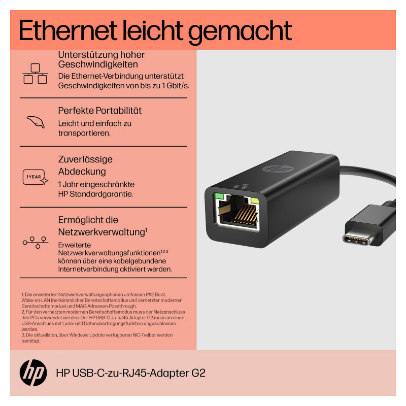 "HP USB-C to RJ45 Adapter G2. Connectivity technology: Wired, Host interface: USB Type-C. Product colour: Black, Country of origin: China, HP segment: Home. Windows operating systems supported: Windows 10, Windows 11, Other operating systems supported: ChromeOS. Width: 180 mm, Depth: 20.6 mm, Height: 16.5 mm. Package width: 200 mm, Package weight: 39 g"\n"Ethernet made easy