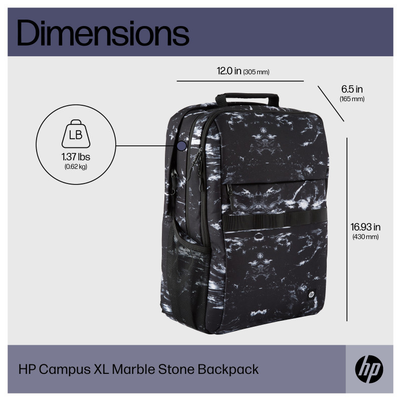 "HP Campus XL Marble Stone Backpack. Case type: Backpack. Weight: 620 g"\n"Secure Everything in its Place