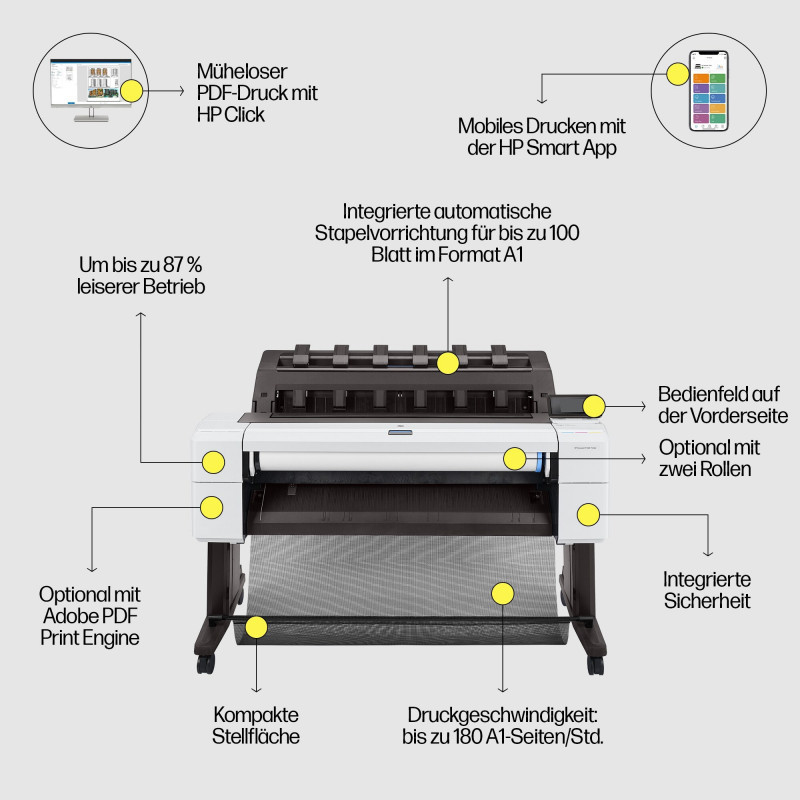 "HP Designjet T1600 36-in PostScript Printer. Print technology: Thermal inkjet, Maximum resolution: 2400 x 1200 DPI, Page description languages: PostScript 3, PDF 1.7, HP-GL/2, TIFF, JPEG, HP-RTL, CALS G4. Maximum print size: 914 x 1219 mm, Paper tray media types: Coated paper, Semi-glossy paper, Glossy paper, Bond paper, Photo paper, Matte paper, Heavy paper,..., ISO A-series sizes (A0...A9): A0, A1, A2, A3, A4. Ethernet interface type: Gigabit Ethernet, Mobile printing technologies: HP ePrint. Product colour: Black, White, Internal storage capacity: 128 GB, Sound power level (standby): 32 dB. Power supply: 100 W, Power consumption (off): 0.3 W, Power consumption (sleep): 10 W"\n" Keep the project momentum. With radically simple solutions and the easiest PDF printing[1], it's easy for everyone to get great results every time. Meet deadlines with the fastest print speed in the most compact, quiet printer.[2]
