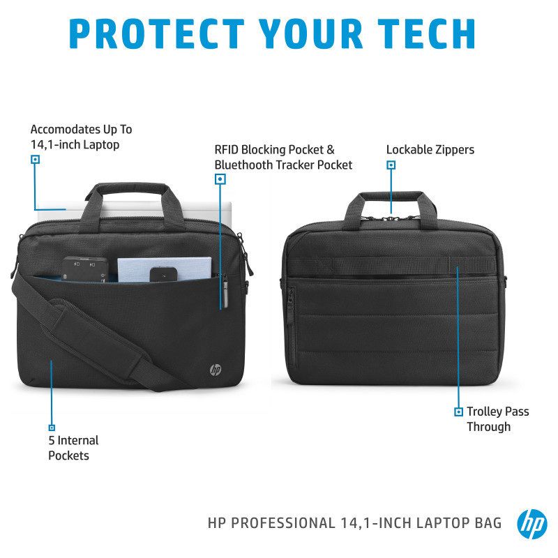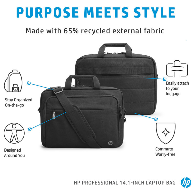 "HP Professional 14.1-inch Laptop Bag. Case type: Messenger case, Maximum screen size: 35.8 cm (14.1""). Weight: 490 g. Surface coloration: Monochromatic"\n"Designed With You and the Environment In Mind