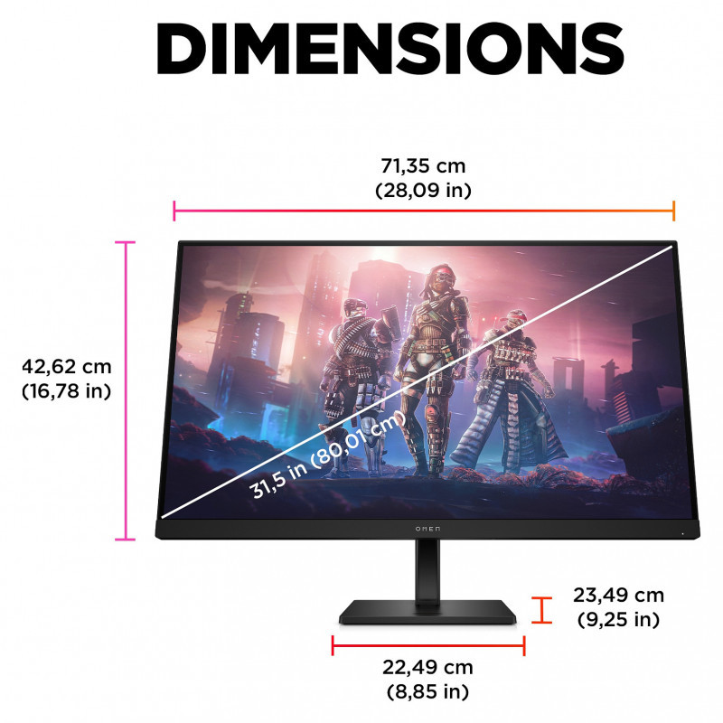"OMEN by HP OMEN by 31.5 inch QHD 165Hz Gaming Monitor - OMEN 32q. Display diagonal: 80 cm (31.5""), Display resolution: 2560 x 1440 pixels, HD type: Quad HD, Display technology: LCD, Display surface: Matt, Response time: 1 ms, Native aspect ratio: 16:9, Viewing angle, horizontal: 178°, Viewing angle, vertical: 178°. VESA mounting, Height adjustment. Product colour: Black"\n"TAKE YOUR FUN UP A NOTCH