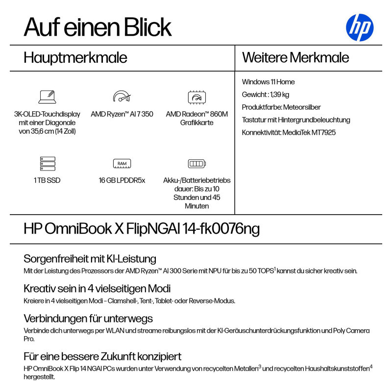 HP OmniBook X Flip 14-fk0076ng AMD Ryzen™ AI 7 350 Next Gen AI Notebook 35,6 cm (14"")