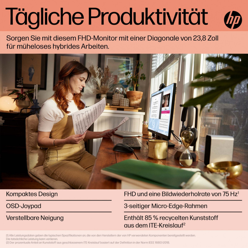 Expand your view and your productivity with this 60.5 cm (23.8-inch) diagonal, FHD monitor when you're working from home or at the office. This sleek monitor makes hybrid work easy and complete via a crisp, smooth screen and simple design, so you can do more everyday."