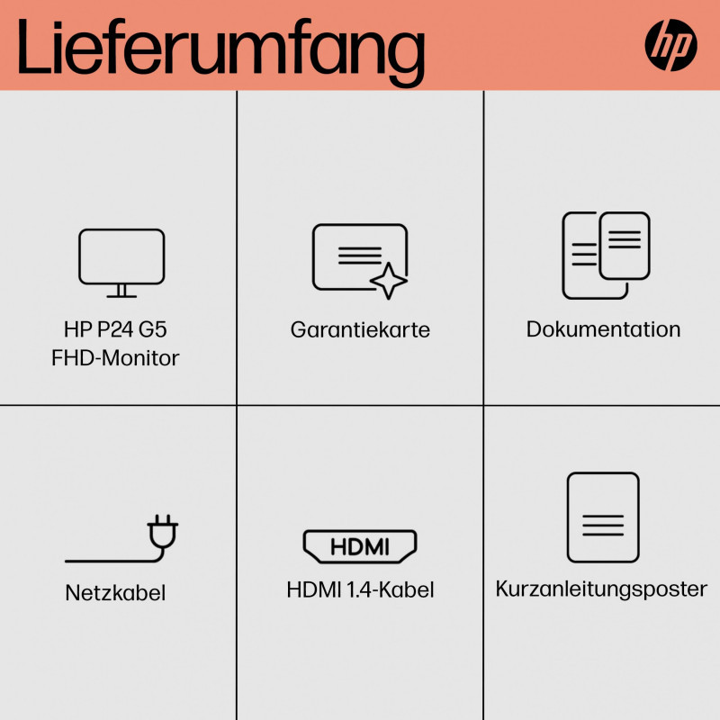 "HP P24 G5 FHD Monitor. Display diagonal: 60.5 cm (23.8""), Display resolution: 1920 x 1080 pixels, HD type: Full HD, Display technology: LCD, Display surface: Matt, Response time: 5 ms, Native aspect ratio: 16:9, Viewing angle, horizontal: 178°, Viewing angle, vertical: 178°. VESA mounting. Product colour: Black"\n"Everyday Productivity