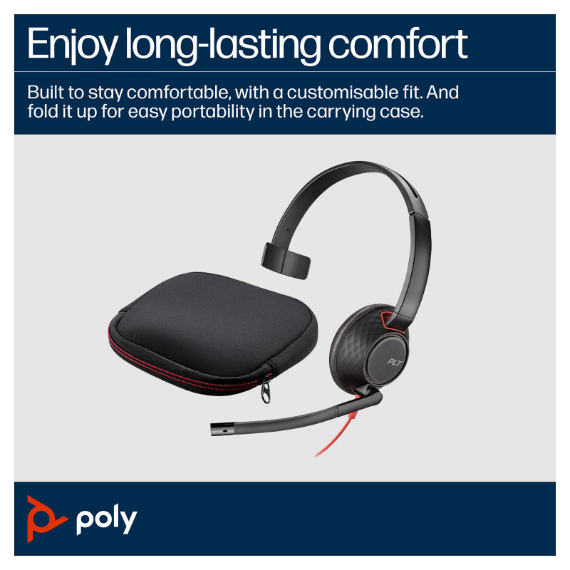 "HP Poly Blackwire 5210 Monaural USB-C Headset +3.5mm Plug +USB-C/A Adapter (Bulk). Product type: Headset. Connectivity technology: Wired. Recommended usage: Office/Call center, Cable length: 2.17 m, Product colour: Black"\n"Wear it well