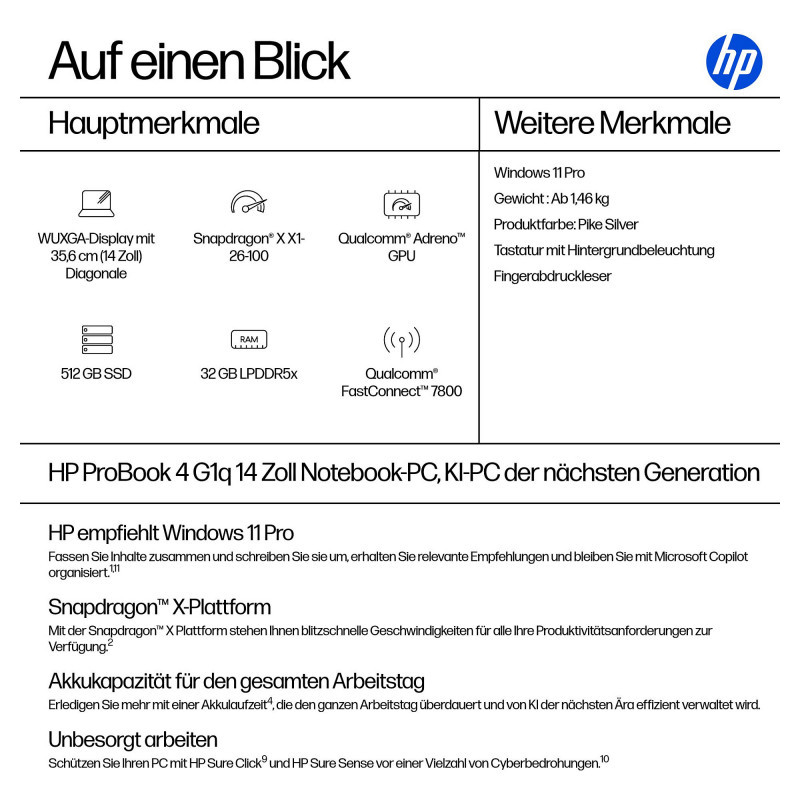 HP ProBook 4 G1q 14 Qualcomm Snapdragon X X1-26-100 35.56cm 14Zoll WUXGA 32GB 512GB/SSD W11P SmartBuy 1J Gar (DE)