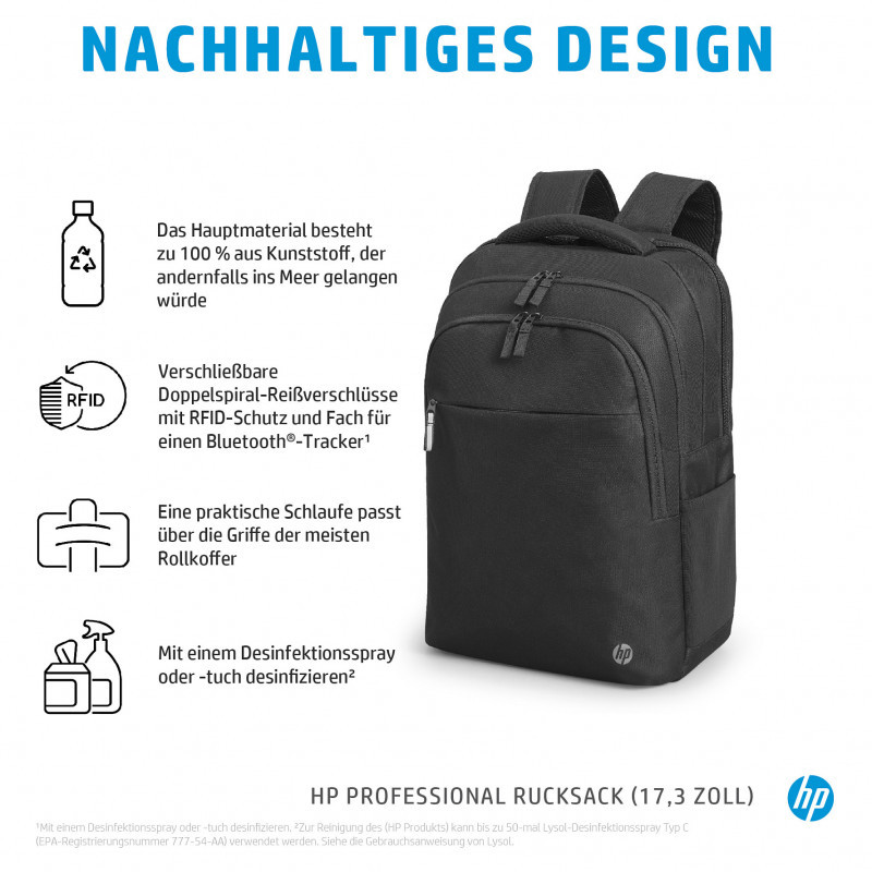 "HP Professional 17.3-inch Backpack. Case type: Backpack, Maximum screen size: 43.9 cm (17.3""). Weight: 740 g. Surface coloration: Monochromatic"\n"Designed With You and the Environment In Mind