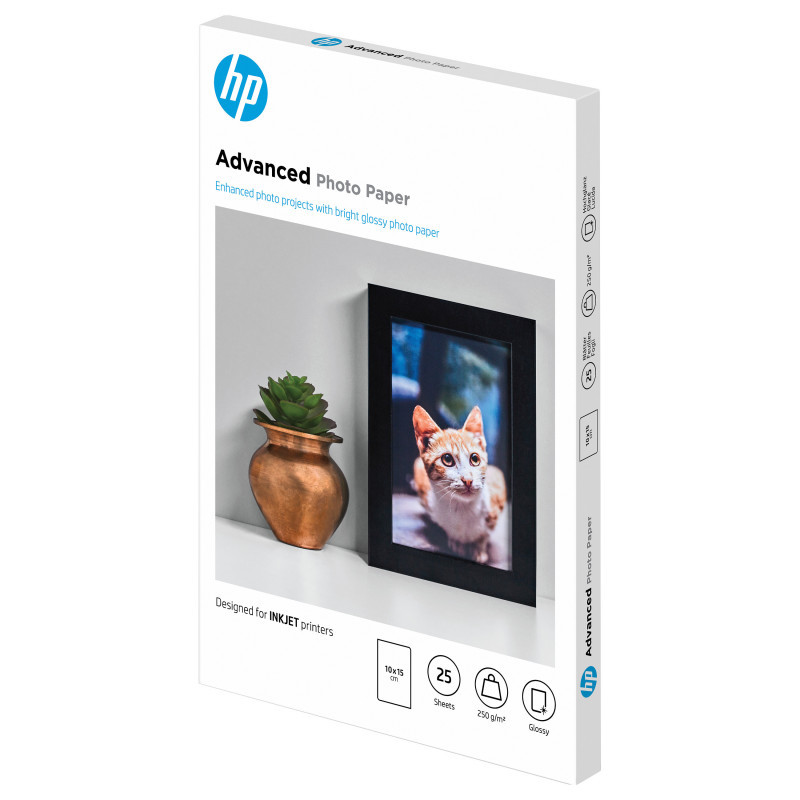 "HP Advanced Photo Paper Glossy 250 g/m2 10 x 15 cm (101 x 152 mm) 25 sheets. Compatible products: Works with inkjet printers, optimized for Original HP Ink. Width: 14.3 mm, Depth: 124 mm, Height: 181 mm. Quantity per pack: 1 pc(s), Package width: 182 mm, Package depth: 124 mm. Pallet gross weight: 119 kg, Master (outer) cases per pallet: 56 pc(s), Layers per pallet: 2 pc(s). Country of origin: China, Germany"\n"Ideal for inkjet printer users and HP Inkjet printer owners printing high-quality, true-to-life photos for scrapbooking, photo albums, and framing.