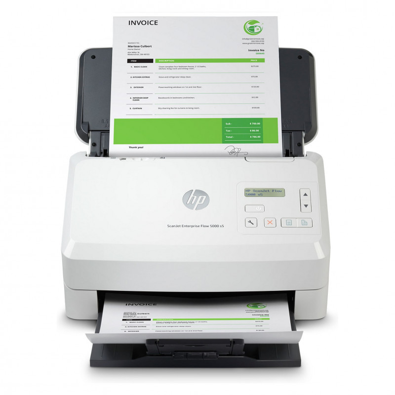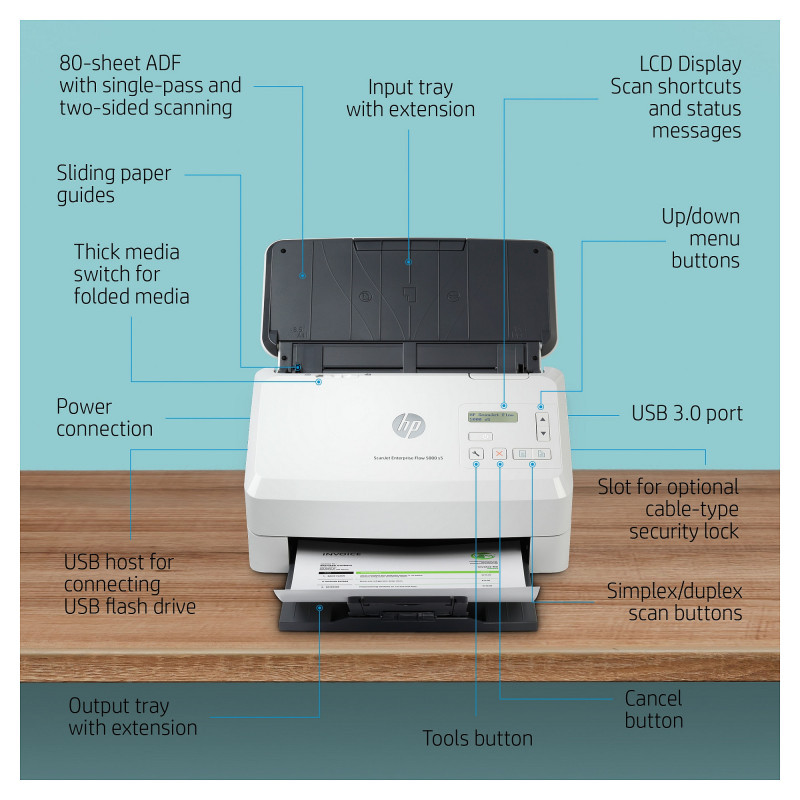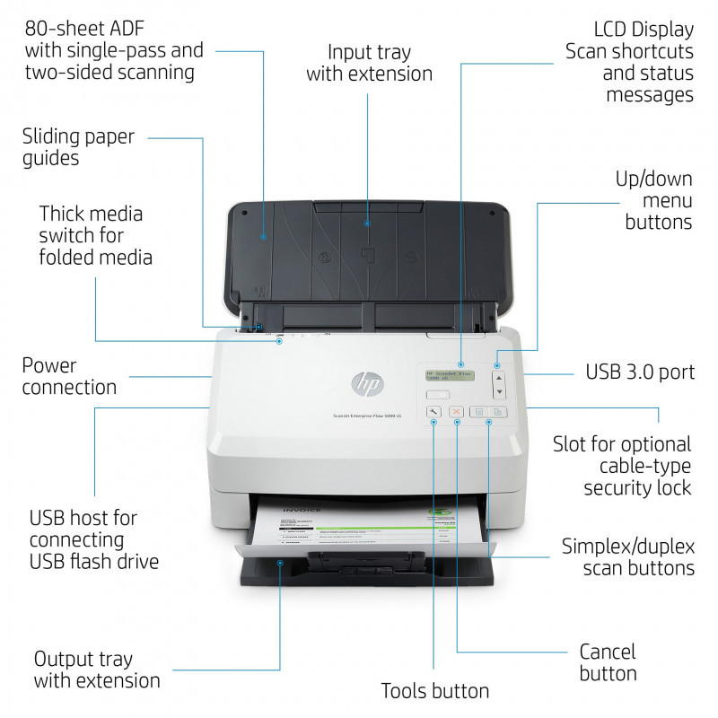"HP Scanjet Enterprise Flow 5000 s5. Maximum scan size: 216 x 3100 mm, Optical scanning resolution: 600 x 600 DPI. Scanner type: Sheet-fed scanner, Product colour: White. Sensor type: CMOS CIS, Daily duty cycle (max): 7500 pages, Scanning noise level: 65 dB. Auto document feeder (ADF) input capacity: 80 sheets. Maximum ISO A-series paper size: A4"\n"Give your office high-volume scanning performance. Recommended for 7,500 pages per day.