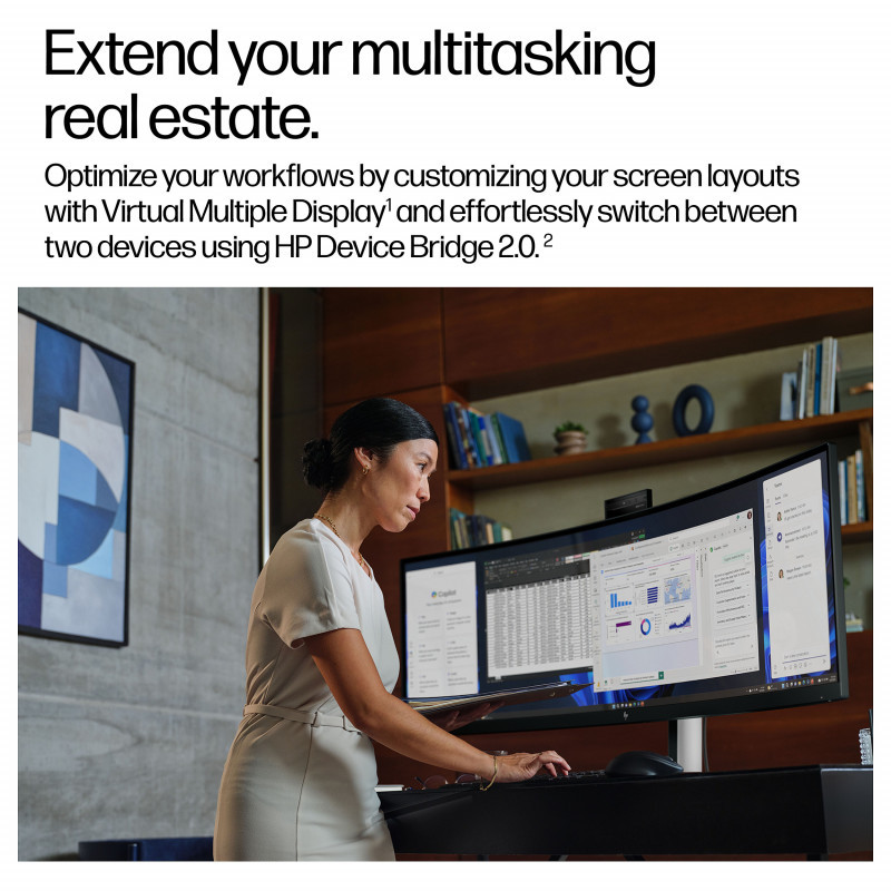 See more, do more, faster with one immersive canvas that supports up to two devices simultaneously for seamless edge-to-edge multitasking with the HP Series 5 Pro 49"" DQHD Conferencing Monitor. Integrate AI conferencing and ecosystem connectivity with this ultrawide command center."