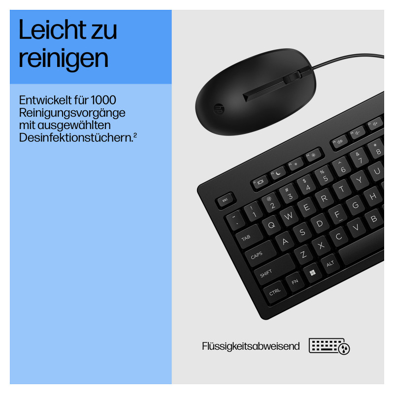"HP 225 Wired Mouse and Keyboard Combo. Keyboard form factor: Full-size (100%), Connectivity technology: Wired, Device interface: USB. Cable length: 1.8 m. Recommended usage: Office. Product colour: Black. Mouse included"\n"Every Day Productivity