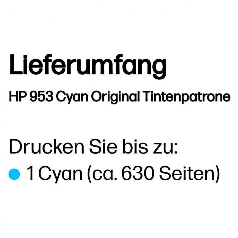 "HP 953 Cyan Original Ink Cartridge. Colour ink type: Pigment-based ink, Cartridge capacity: Standard Yield, Colour ink page yield: 630 pages, Colour ink volume: 9 ml, Printing colours: Cyan, Quantity per pack: 1 pc(s)"\n"Ideal for large workgroups who need dependable performance for affordable, professional-quality printing, page after page.