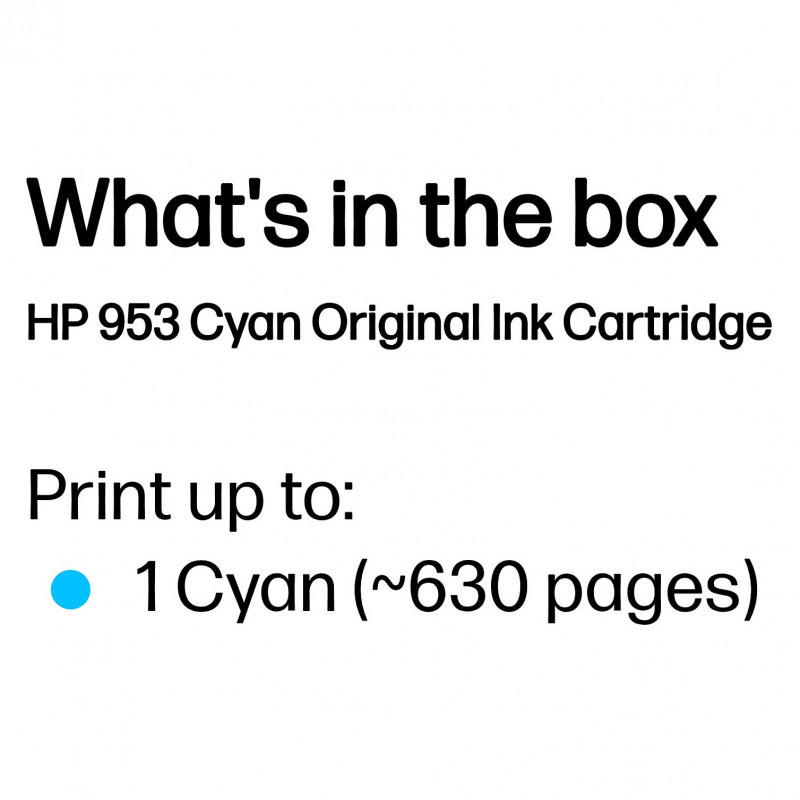 "HP 953 Cyan Original Ink Cartridge. Colour ink page yield: 630 pages, Printing colours: Cyan, Quantity per pack: 1 pc(s)"\n"Ideal for large workgroups who need dependable performance for affordable, professional-quality printing, page after page.