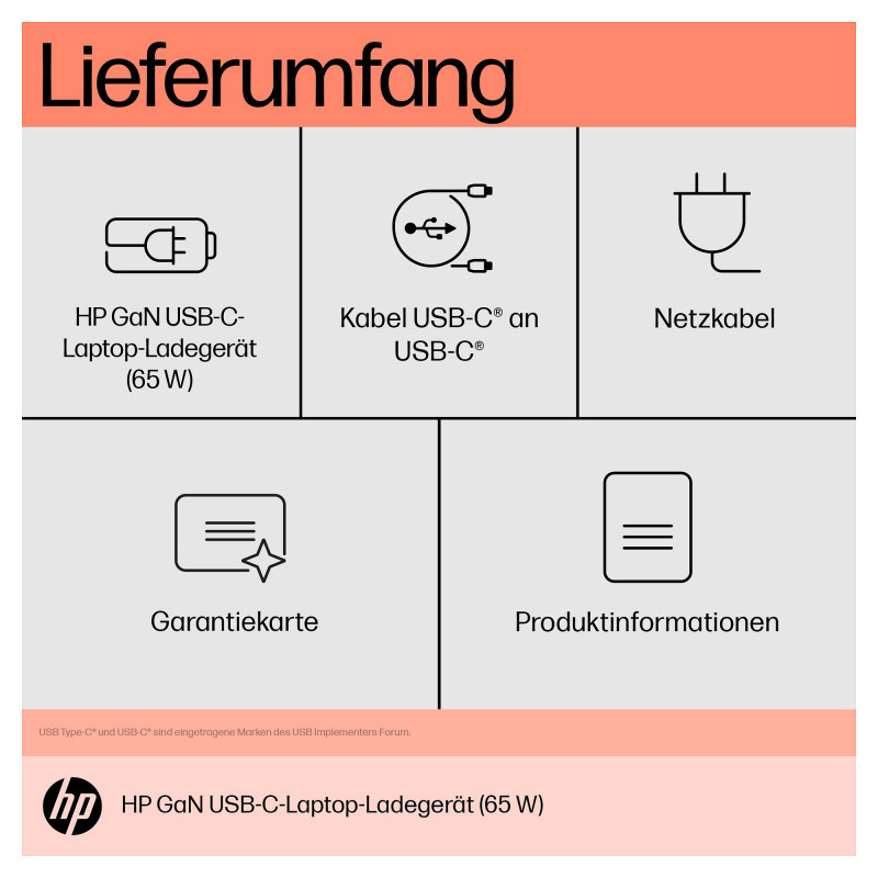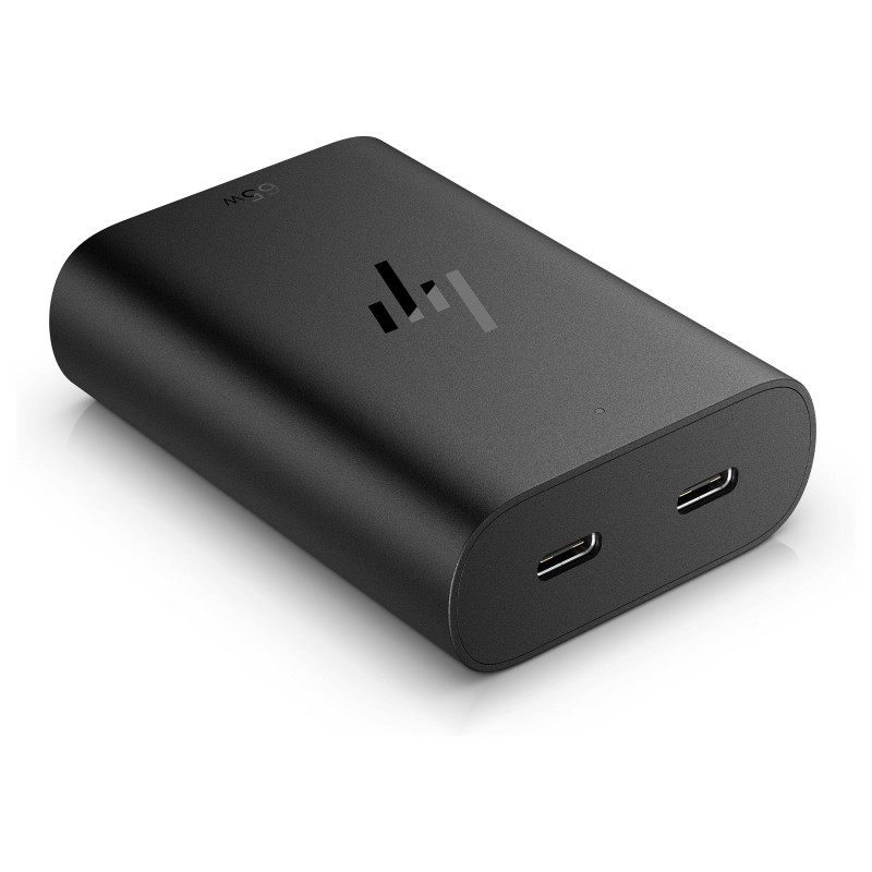 "HP 65W GaN USB-C Laptop Charger. Purpose: Laptop, Power supply type: Indoor, Output power: 65 W. USB connector type: USB Type-C. Product colour: Black. Compliance certificates: CCC, Federal Communications Commission (FCC), CE. Sustainable technologies and materials: Outside box and corrugated cushions are 100% sustainably sourced and recyclable; 30% post-consumer..."\n"Powerfully Petite