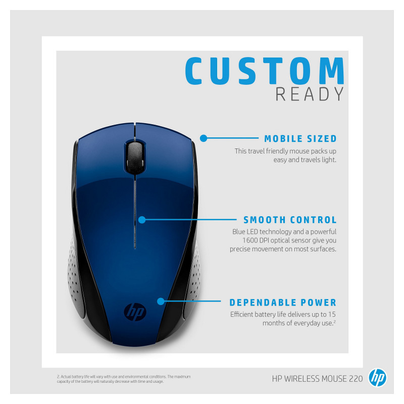 "HP Wireless Mouse 220 (Lumiere Blue). Form factor: Ambidextrous. Device interface: RF Wireless, Buttons type: Pressed buttons, Buttons quantity: 3, Scroll type: Wheel. Power source: Batteries. Product colour: Blue"\n"An ambidextrous travel-sized wireless mouse with long battery life