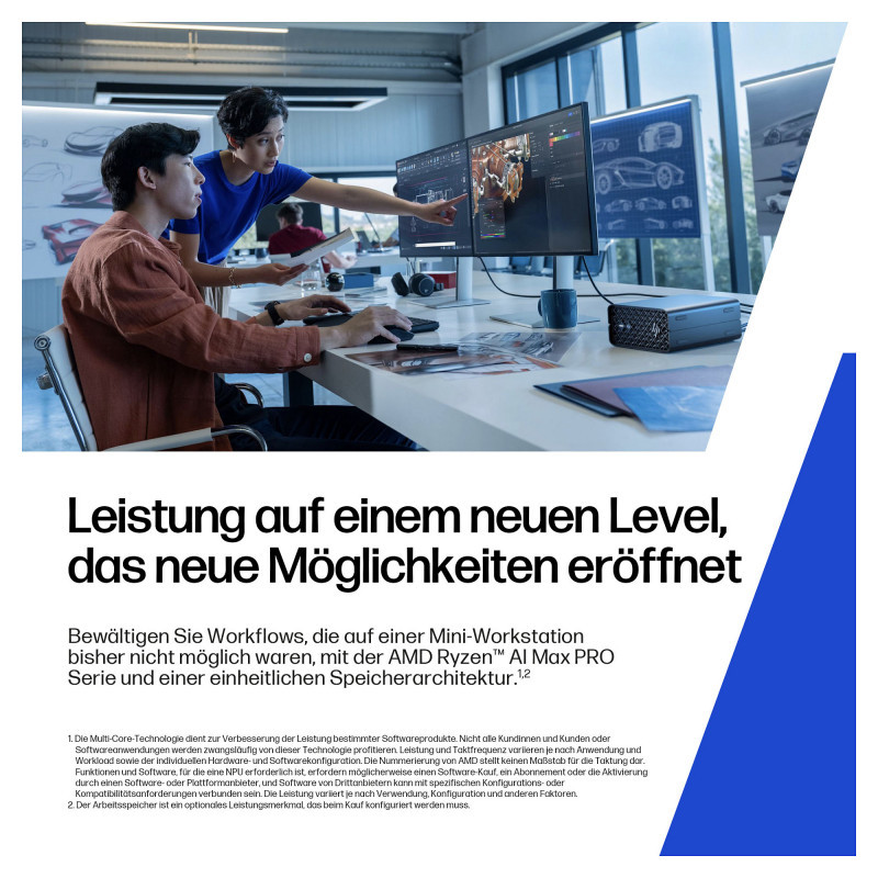 "HP Z2 G1a. Processor frequency: 3.2 GHz, Processor family: AMD Ryzen AI Max PRO, Processor model: 390. Internal memory: 32 GB, Internal memory type: LPDDR5x-SDRAM, Memory clock speed: 8533 MHz. Total storage capacity: 1 TB, Storage media: SSD. On-board graphics card model: AMD Radeon 8050S. Operating system installed: Windows 11 Pro. Power supply: 300 W. Chassis type: Mini PC. Product type: Workstation. Weight: 2.3 kg. Product colour: Black"\n"Mini workstation. Transformative AI performance.