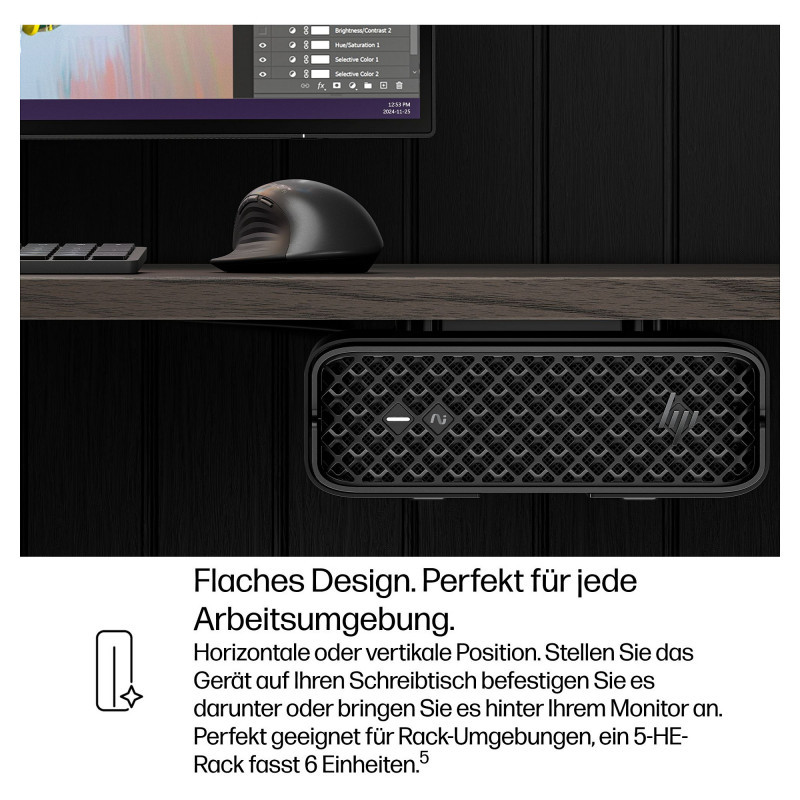"HP Z2 G1i. Processor family: Intel Core Ultra 7, Processor model: 265. Internal memory: 32 GB, Internal memory type: DDR5-SDRAM, Memory clock speed: 6400 MHz. Total storage capacity: 1 TB, Storage media: SSD. On-board graphics card model: Intel Graphics, Discrete graphics card model: NVIDIA RTX A400. Wi-Fi. Operating system installed: Windows 11 Pro. Power supply: 280 W. Chassis type: Mini PC. Product type: Workstation. Product colour: Black"\n"Powers large workflows. Fits a tiny space.