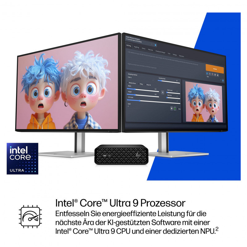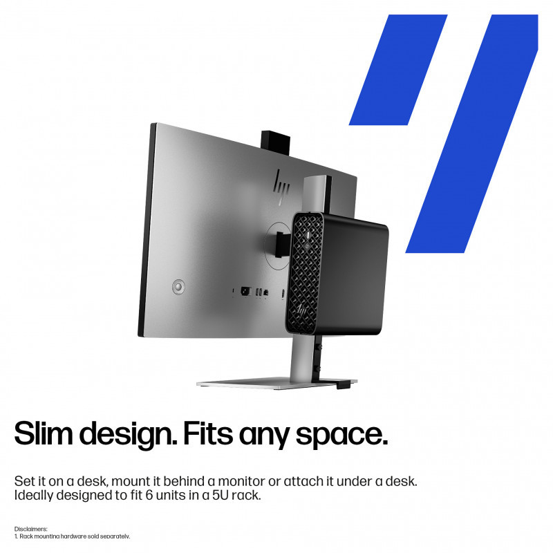 "HP Z2 G1i. Processor family: Intel Core Ultra 9, Processor model: 285K. Internal memory: 64 GB, Internal memory type: DDR5-SDRAM, Memory clock speed: 6400 MHz. Total storage capacity: 1 TB, Storage media: SSD. On-board graphics card model: Intel Graphics, Discrete graphics card model: NVIDIA RTX 2000 Ada. Wi-Fi. Operating system installed: Windows 11 Pro. Power supply: 280 W. Chassis type: Mini PC. Product type: Workstation. Product colour: Black"\n"Powers large workflows. Fits a tiny space.