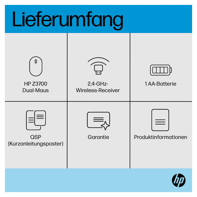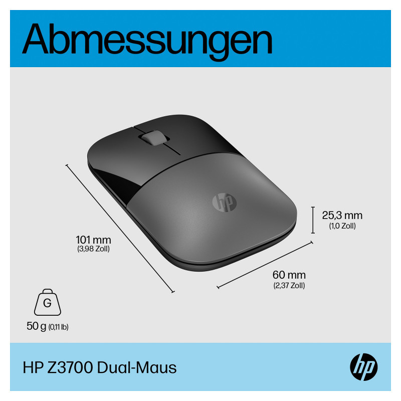 "HP Z3700 Dual Silver Mouse. Form factor: Ambidextrous. Device interface: RF Wireless + Bluetooth, Buttons quantity: 3, Scroll type: Wheel. Power source: Batteries. Product colour: Silver"\n"Ready for Anything Anywhere