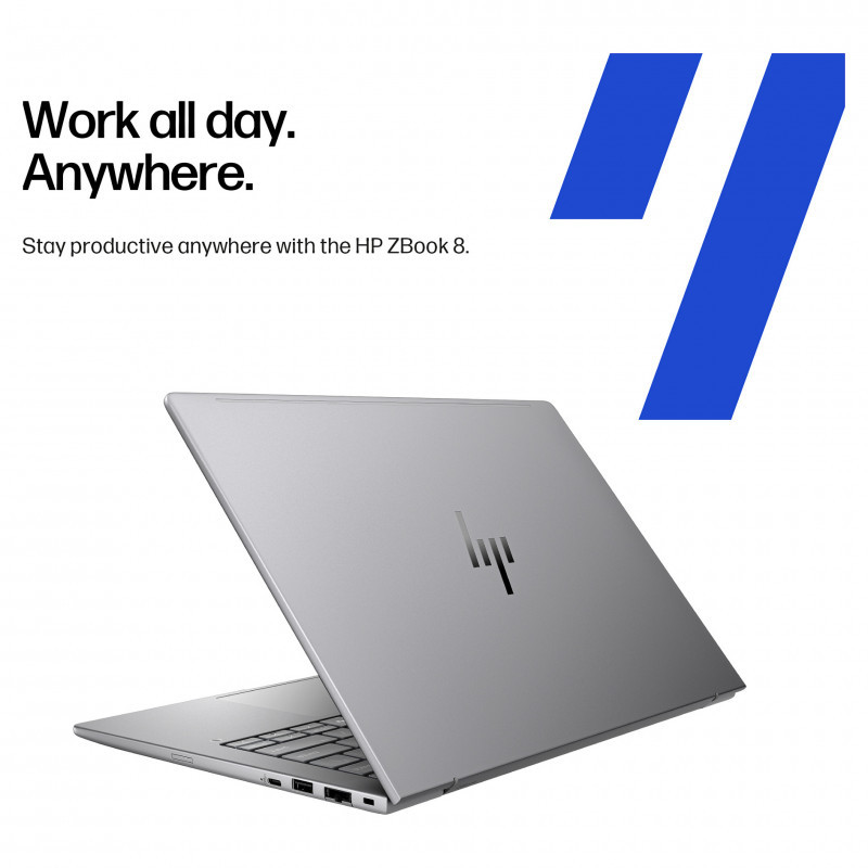 "HP ZBook 8 G1ak. Product type: Mobile workstation, Form factor: Clamshell. Processor family: AMD Ryzen AI 7 PRO, Processor model: 350, Processor frequency: 2 GHz. Display diagonal: 35.6 cm (14""), HD type: WUXGA, Display resolution: 1920 x 1200 pixels. Internal memory: 32 GB, Internal memory type: DDR5-SDRAM. Total storage capacity: 1 TB, Storage media: SSD. On-board graphics card model: AMD Radeon 860M. Operating system installed: Windows 11 Pro. Product colour: Silver"\n"Up level performance. Not size.