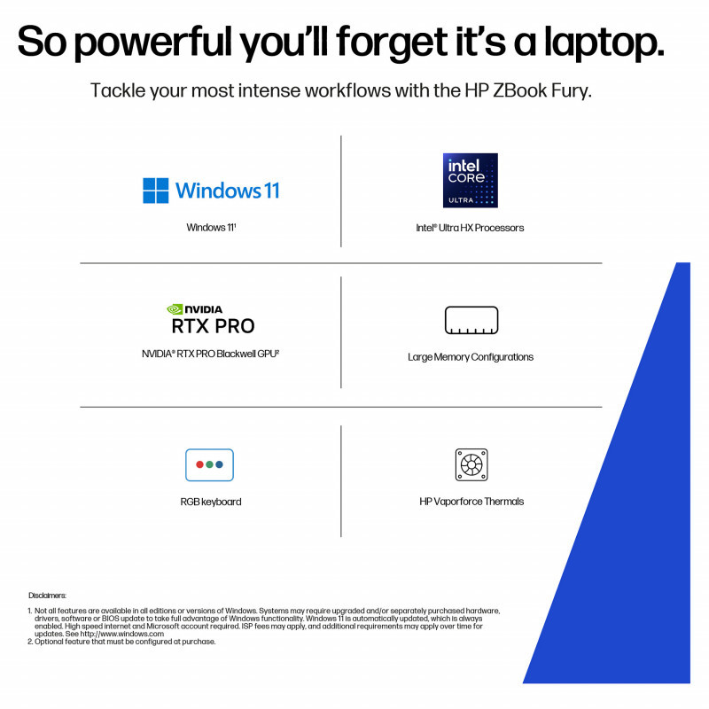 "HP ZBook Fury G1i. Product type: Mobile workstation, Form factor: Clamshell. Processor family: Intel Core Ultra 9, Processor model: 285HX. Display diagonal: 45.7 cm (18""), HD type: WQXGA, Display resolution: 2560 x 1600 pixels. Internal memory: 64 GB, Internal memory type: DDR5-SDRAM. Total storage capacity: 2 TB, Storage media: SSD. On-board graphics card model: Intel® Graphics, Discrete graphics card model: NVIDIA RTX PRO 3000 Blackwell. Operating system installed: Windows 11 Pro. Product colour: Silver"\n"So powerful you’ll forget it’s a laptop.