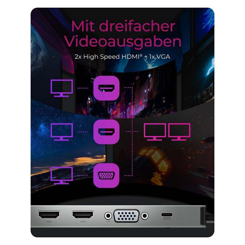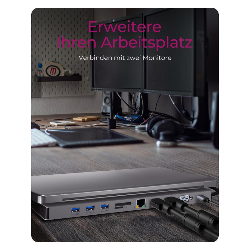 "ICY BOX 11-in-1 via USB Type-C. Connectivity technology: Wired, Host interface: USB 3.2 Gen 1 (3.1 Gen 1) Type-C, USB Power Delivery up to: 100 W. Ethernet LAN data rates: 10,100,1000 Mbit/s. Product colour: Anthracite, Black, Compatible memory cards: MicroSD (TransFlash), SD, Data transfer rate: 5 Gbit/s. Power source type: USB, Output voltage: 5 V, Output current: 1.5 A. Windows operating systems supported: Windows 10"\n"More Options