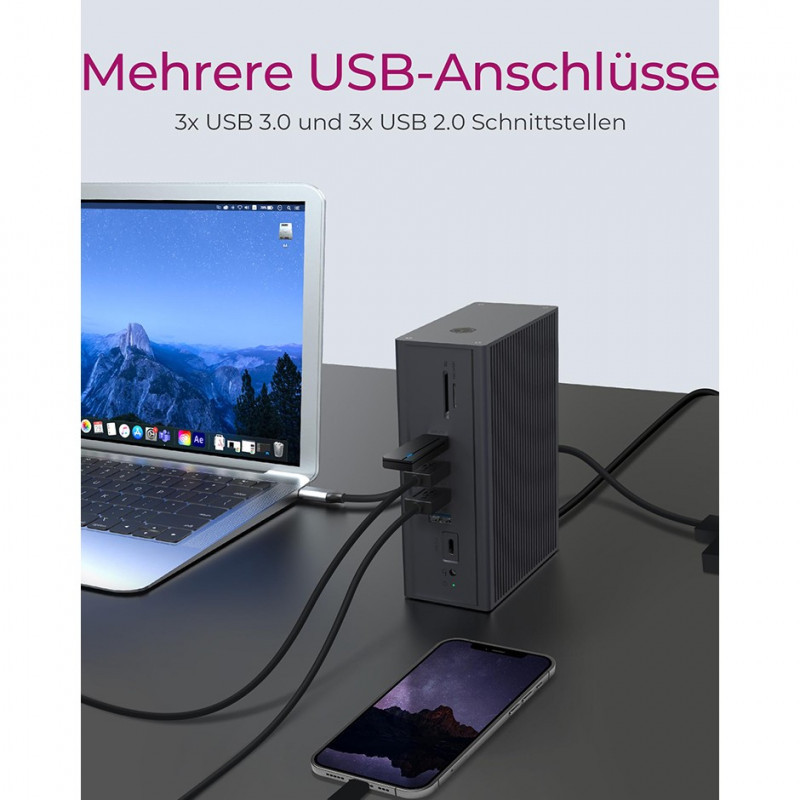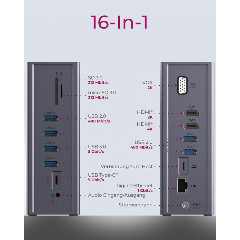 "ICY BOX IB-DK2262AC. Connectivity technology: Wired, Host interface: USB 3.2 Gen 1 (3.1 Gen 1) Type-C, USB Power Delivery up to: 55 W. Ethernet LAN data rates: 10,100,1000 Mbit/s. Product colour: Anthracite, Compatible memory cards: MicroSD (TransFlash), SD, HD type: 4K Ultra HD. Power source type: AC, AC input voltage: 100-240 V, AC input frequency: 50 - 60 Hz. Windows operating systems supported: Windows 10, Windows 11, Windows 8, Other operating systems supported: ChromeOS"\n"Rugged aluminium design