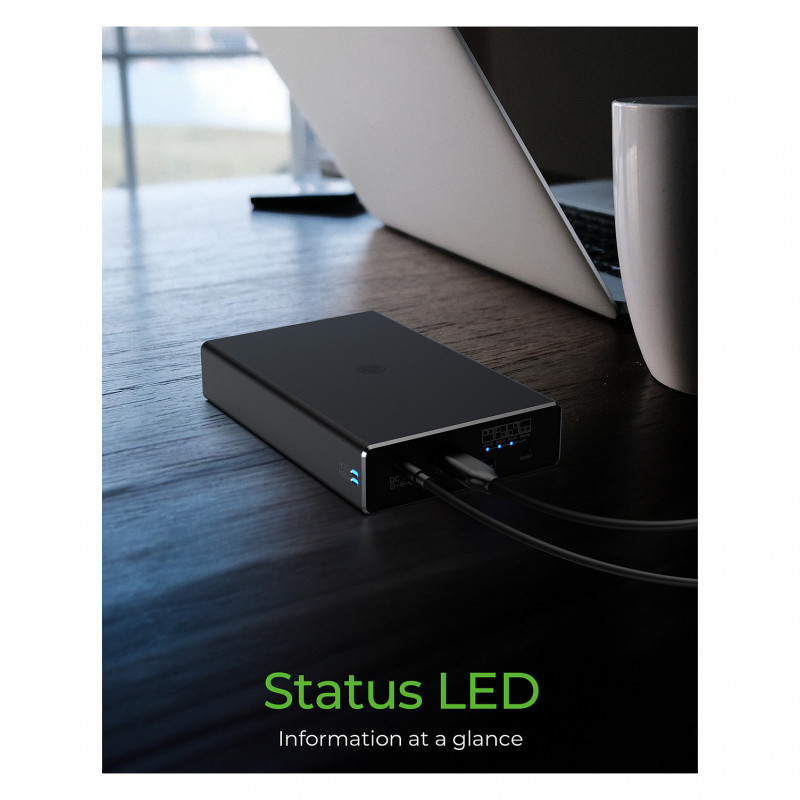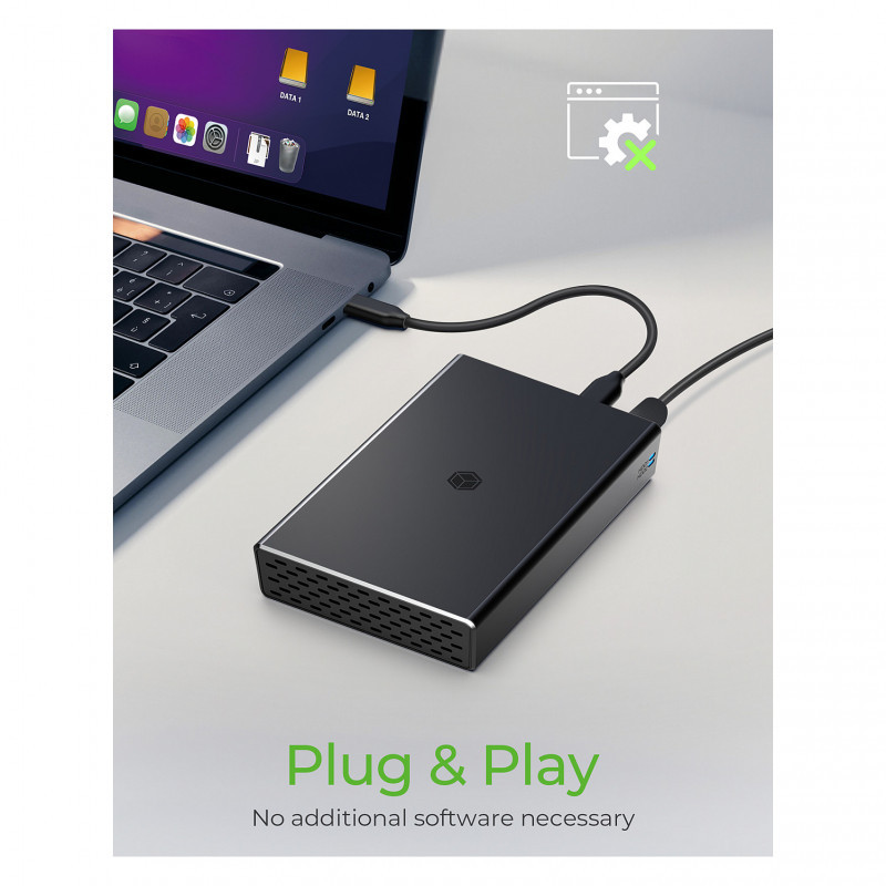 The enclosure is made from aluminium and therefore very durable. Designed with passive cooling and without a fan, both professional and private workplaces benefit from this very silent setup. A status LED keeps you informed about the current state of the installed drives at all times."