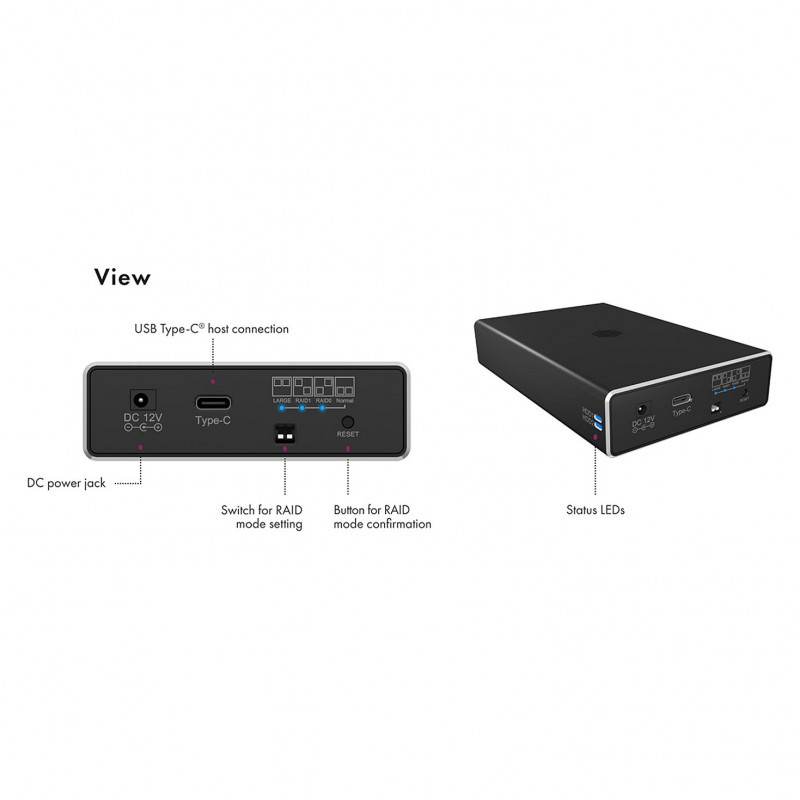 "ICY BOX RAID enclosure for 2x HDD/SSD USB 3.2 Gen 2 Type-C® / Type-A interface. Product type: HDD/SSD enclosure. Number of storage drives supported: 1, Storage drive size: 2.5"", Supported storage drive interfaces: Serial ATA, Serial ATA II, Serial ATA III. Data transfer rate: 10 Gbit/s. RAID levels: 0, 1. Product colour: Black. USB connector type: USB Type-C"\n"Failure safety or performance
