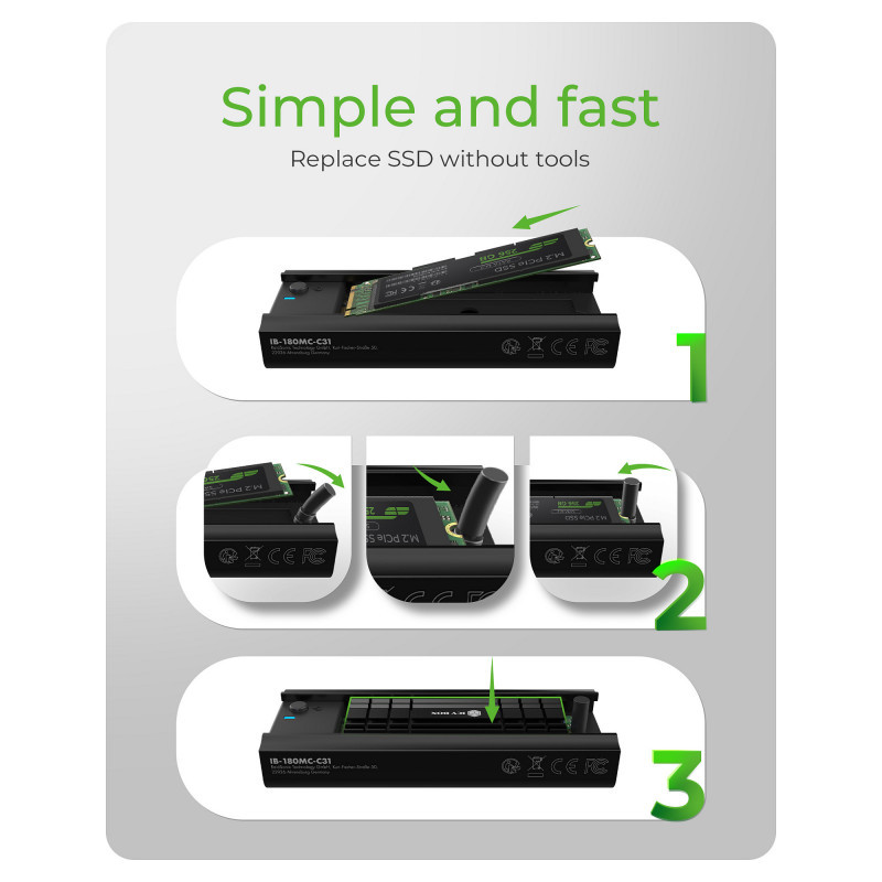 Change your M.2 SSD without tools and expand your storage on your PC and notebook quickly and easily. Connect the IB-180MC-C31 with the included USB Type-C cable and switch to maximum storage with the ""On"" button. This way you can save your precious data without much effort.