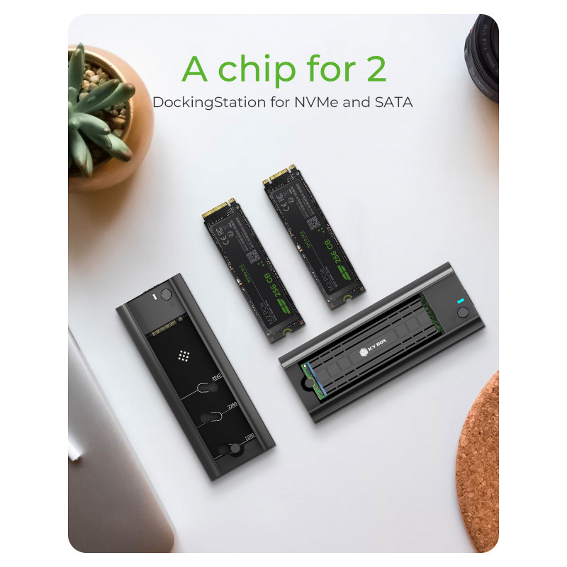 Regardless of whether you want to use an M.2 SSD in NVMe or SATA standard, with the IB-180MC-C31 DockingStation you make the right choice. M.2 storage in sizes of 22x 42, 60 or 80 mm find their place here and you have fast data access thanks to transfer rates of up to 10 Gbit/s."
