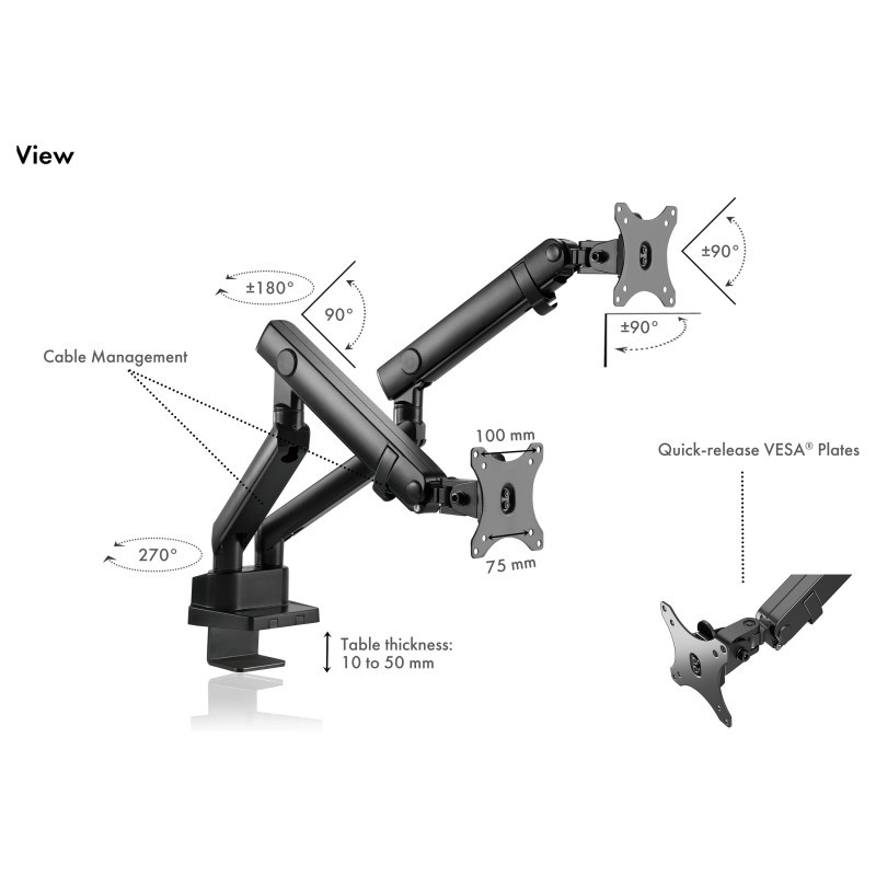 "ICY BOX IB-MS314-T. Mounting: Clamp, Maximum weight capacity: 16 kg, Maximum screen size: 81.3 cm (32""), Minimum VESA mount: 75 x 75 mm, Maximum VESA mount: 100 x 100 mm. Swivel angle range: -90 - 90°, Tilt angle range: -45 - 90°. Product colour: Black"\n"Flexible