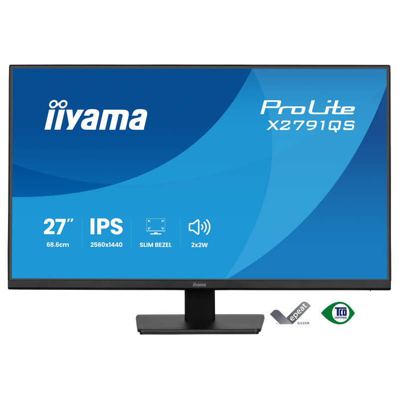 "iiyama ProLite X2791QS-B1. Display diagonal: 68.6 cm (27""), Display resolution: 2560 x 1440 pixels, HD type: Quad HD, Display technology: LED, Display surface: Matt, Native aspect ratio: 16:9, Viewing angle, horizontal: 178°, Viewing angle, vertical: 178°. Built-in speaker(s). VESA mounting. Product colour: Black"\n"The ProLite X2791QS features a 27"" QHD (2560x1440) display with a sleek 4-side slim bezel design, helping you create a clean and modern multi-monitor workspace. The IPS panel delivers sharp detail, vivid colours and consistent brightness from all angles. Flicker-free technology and a blue light reducer enhance eye comfort, especially during extended use. Integrated speakers and a headphone socket support a clutter-free desk setup while providing convenient audio for calls. With EPEAT Silver registration and TCO Certified compliance, the X2791QS supports efficient work and meets recognised environmental standards."