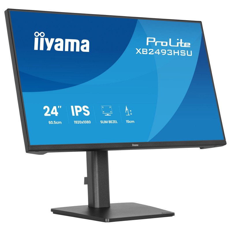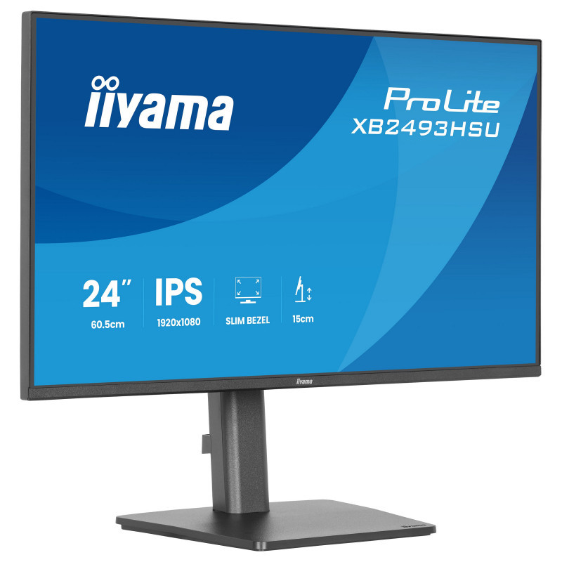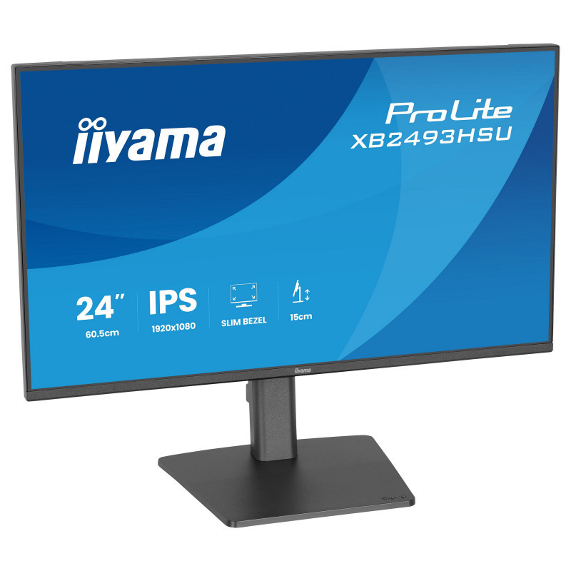 "iiyama ProLite XB2493HSU-B1. Display diagonal: 60.5 cm (23.8""), Display resolution: 1920 x 1080 pixels, HD type: Full HD, Display technology: LED, Display surface: Matt, Response time: 1 ms, Native aspect ratio: 16:9, Viewing angle, horizontal: 178°, Viewing angle, vertical: 178°. Built-in speaker(s). Built-in USB hub, USB hub version: 2.0. VESA mounting, Height adjustment. Product colour: Black"\n"The ProLite XB2493HSU is perfect if you need a compact, high-performance monitor that fits seamlessly into a multi-screen workspace. The four-side ultra-slim bezel design gives you a clean, modern desk setup and uninterrupted viewing across displays. You’ll enjoy sharp detail, vivid colours and wide viewing angles with the IPS panel, while the 120Hz refresh rate keeps everything smooth and responsive. Flicker-free technology and a blue light reducer support your eye comfort during long hours of use. The fully adjustable ergonomic stand helps you stay comfortable and focused, with 15cm height adjustment plus tilt, swivel and pivot functions, so you can easily set the screen to match your posture. Built-in speakers, a two-port USB hub, HDMI and DisplayPort inputs, and a headphone socket keep your workspace simple and connected. With EPEAT registration, TCO10 compliance and an Energy Label C rating, it’s a smart, sustainable choice that works as hard as you do."