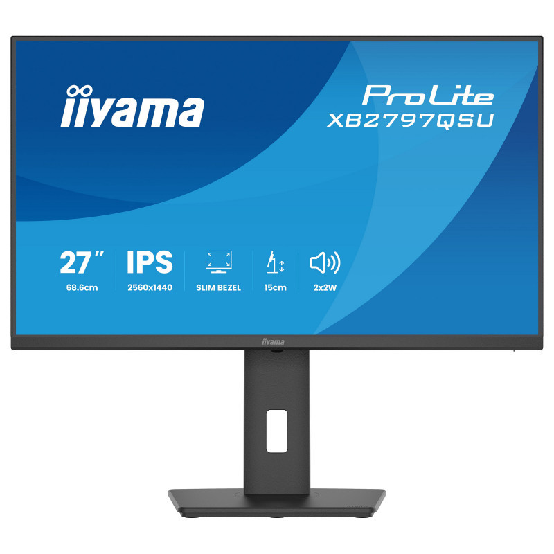 "iiyama ProLite XB2797QSU-B1. Display diagonal: 68.6 cm (27""), Display resolution: 2560 x 1440 pixels, HD type: Quad HD, Display technology: LED, Display surface: Matt, Response time: 1 ms, Native aspect ratio: 16:9, Viewing angle, horizontal: 178°, Viewing angle, vertical: 178°. Built-in speaker(s). Built-in USB hub, USB hub version: 3.2 Gen 1 (3.1 Gen 1). VESA mounting, Height adjustment. Product colour: Black"\n"The ProLite XB2797QSU is perfect if you want a compact, high-performance display that fits seamlessly into a multi-monitor setup. The four-side slim bezel creates a clean, modern workspace and ensures uninterrupted visuals across screens. With a sharp QHD 2560x1440 resolution and IPS panel technology, this 27-inch monitor delivers outstanding image clarity, consistent colour accuracy and wide viewing angles. It is ideal for professionals who multitask, work with detailed visuals or compare documents side by side. Adjust the screen to suit your posture with a fully ergonomic stand offering 15 cm height adjustment, as well as tilt, swivel and pivot functions. This helps you create a comfortable and healthy workspace tailored to your individual needs. Whether you're working on documents, editing content or browsing the web, flicker-free technology and TÜV Rheinland Eye Comfort certification ensure the display meets strict criteria for low blue light and long-term viewing safety. The XB2797QSU also comes equipped with integrated stereo speakers, a four-port USB hub, and versatile connectivity options including HDMI, DisplayPort, and a headphone socket, helping you maintain an organised and efficient workspace. Certified to EPEAT Silver and TCO10 standards, the XB2797QSU offers reliable performance and essential user-focused features for productive modern work environments."