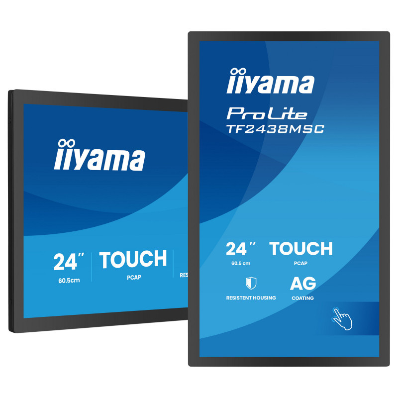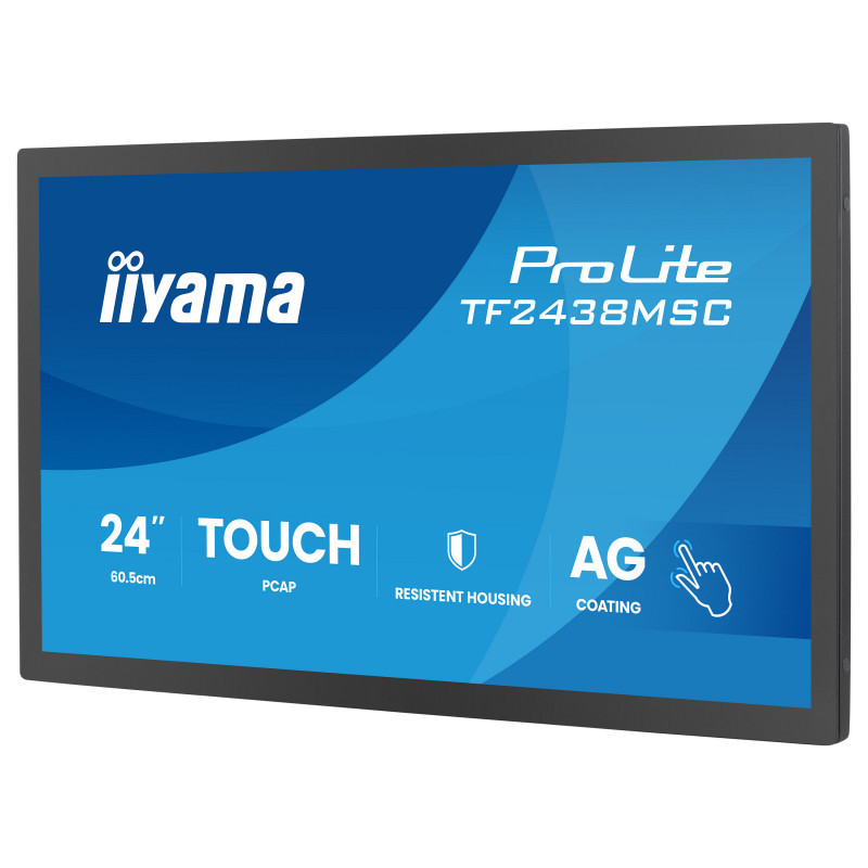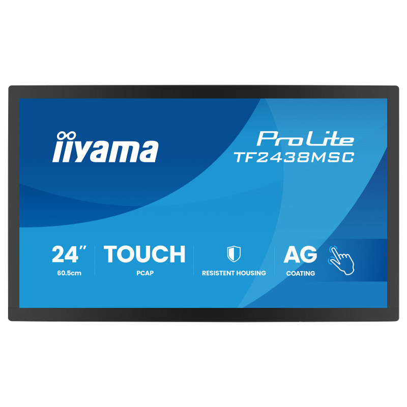 "iiyama TF2438MSC-B2. Display diagonal: 60.5 cm (23.8""), Display resolution: 1920 x 1080 pixels, Display technology: LCD. Product colour: Black, Mean time between failures (MTBF): 50000 h. Energy efficiency class: E, Energy consumption per 1000 hours: 18 kWh, Power consumption (typical): 22 W. Width: 562 mm, Depth: 47.5 mm, Height: 367 mm. Package weight: 8.2 kg, Package depth: 115 mm, Package width: 635 mm"\n"The ProLite TF2438MSC-B2 is a robust and highly responsive 24"" Full HD open frame touchscreen monitor designed for professional integration in demanding commercial and industrial environments. The IPS panel delivers sharp detail, accurate colours and wide viewing angles, ensuring excellent visibility whether installed at service counters, kiosks, control points or customer-facing systems. Featuring DeepContrast PCAP+ 10-point touch technology with optical bonding, the screen provides smooth, precise interaction with reduced reflections for improved readability in bright environments. The edge-to-edge glass is protected with a scratch-resistant 7H surface and anti-fingerprint coating, helping maintain a clean, professional appearance even under heavy daily use. With IPX1 protection against humidity and dripping water, the display offers additional reliability in busy or semi-exposed locations. Built with a durable metal housing, the TF2438MSC-B2 is engineered for long-term operation and seamless integration into enclosures, kiosks and custom installations. Flexible connectivity, integrated speakers and support for landscape, portrait and face-up orientations provide maximum installation freedom across a wide range of applications including retail, POS, interactive signage, automation systems and industrial environments. A dependable touchscreen solution designed to perform where reliability, durability and precision matter most."