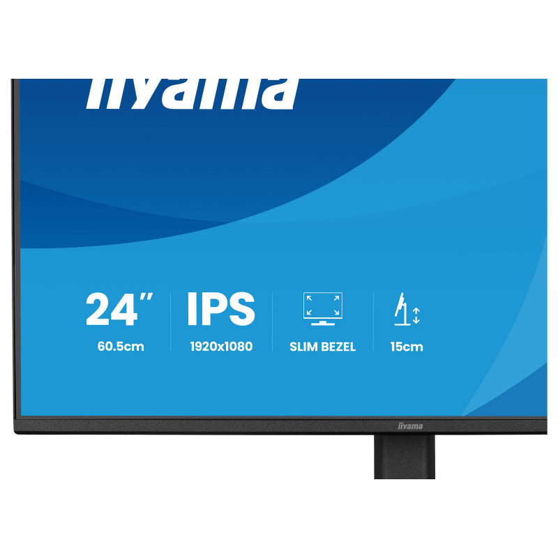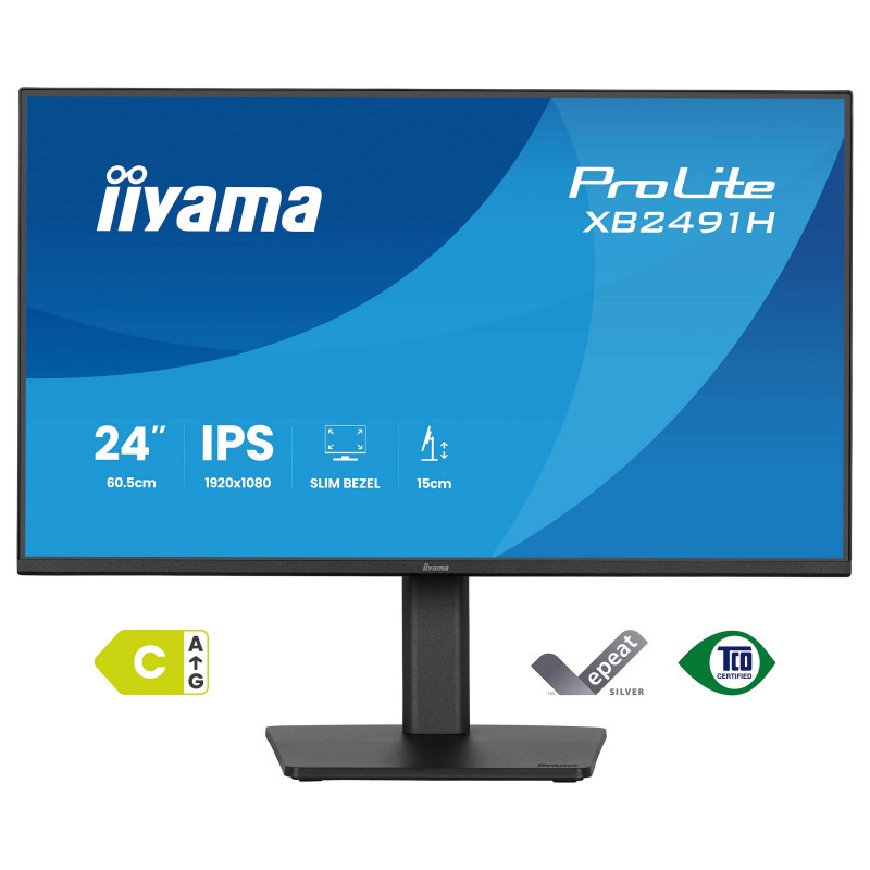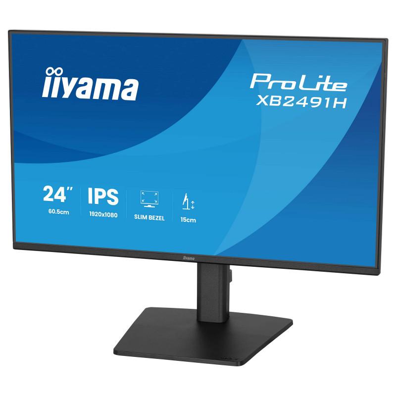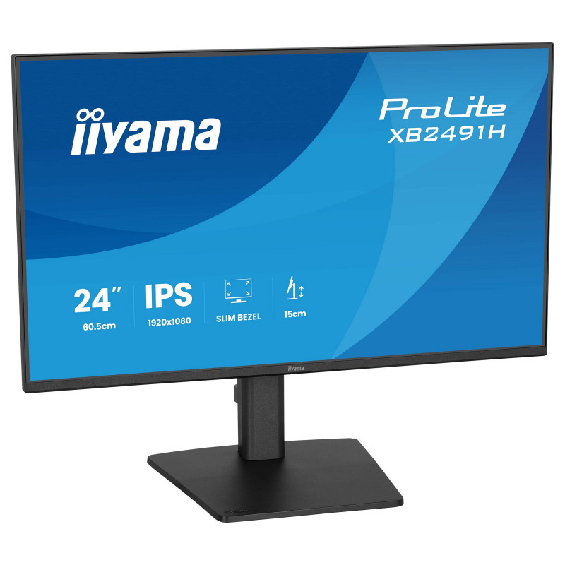 "iiyama ProLite XB2491H-B1. Display diagonal: 60.5 cm (23.8""), Display resolution: 1920 x 1080 pixels, HD type: Full HD, Display technology: LCD, Display surface: Matt, Native aspect ratio: 16:9, Viewing angle, horizontal: 178°, Viewing angle, vertical: 178°. VESA mounting, Height adjustment. Product colour: Black"\n"The ProLite XB2491H features a 24'' Full HD display with a sleek 4-side slim bezel design, helping you create a clean and modern multi-monitor workspace. The IPS panel delivers sharp detail, vivid colours and consistent brightness from all angles. With a fast 120Hz refresh rate, visuals remain smooth and responsive, whether you're working on complex tasks or enjoying multimedia. Flicker-free technology and a blue light reducer enhance eye comfort, especially during extended use. Its ergonomic stand offers 15cm of height adjustment along with tilt, swivel and pivot functions, so you can easily position the screen to suit your posture and stay comfortable throughout the day. A headphone socket provides convenient audio connectivity for private listening and online calls. With EPEAT Silver registration, TCO Certified compliance and an Energy Label C rating, the XB2491H supports both efficient work and responsible energy use."