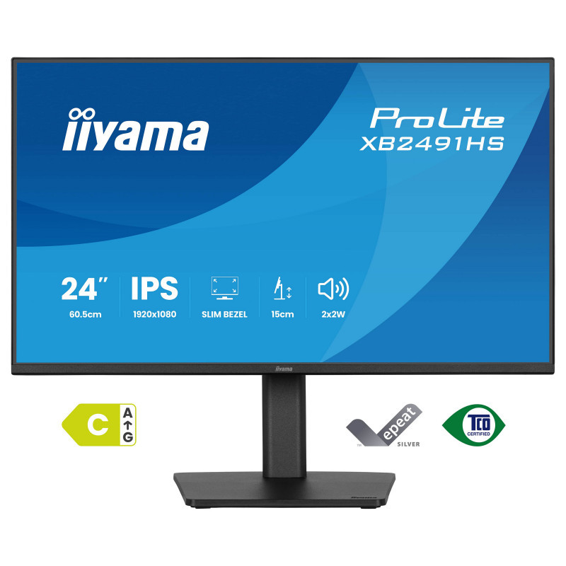 "iiyama ProLite XB2491HS-B1. Display diagonal: 60.5 cm (23.8""), Display resolution: 1920 x 1080 pixels, HD type: Full HD, Display technology: LCD, Display surface: Matt, Native aspect ratio: 16:9, Viewing angle, horizontal: 178°, Viewing angle, vertical: 178°. Built-in speaker(s). VESA mounting, Height adjustment. Product colour: Black"\n"The ProLite XB2491HS features a 24'' Full HD display with a sleek 4-side slim bezel design, helping you create a clean and modern multi-monitor workspace. The IPS panel delivers sharp detail, vivid colours and consistent brightness from all angles. With a fast 120Hz refresh rate, visuals remain smooth and responsive, whether you're working on complex tasks or enjoying multimedia. Flicker-free technology and a blue light reducer enhance eye comfort, especially during extended use. Its ergonomic stand offers 15cm of height adjustment along with tilt, swivel and pivot functions, so you can easily position the screen to suit your posture and stay comfortable throughout the day. Integrated speakers and a headphone socket support a clutter-free desk setup while providing convenient audio for calls. With EPEAT Silver registration, TCO Certified compliance and an Energy Label C rating, the XB2491HS supports both efficient work and responsible energy use."