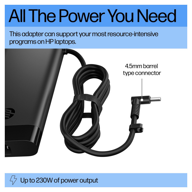 Harness the power to charge high-performance laptops[1] reliably and efficiently. Boasting up to 230W of power output, this thoughtfully designed 4.5mm charger is tested with HP laptop devices to ensure it can safely fuel your most demanding work.[1]"