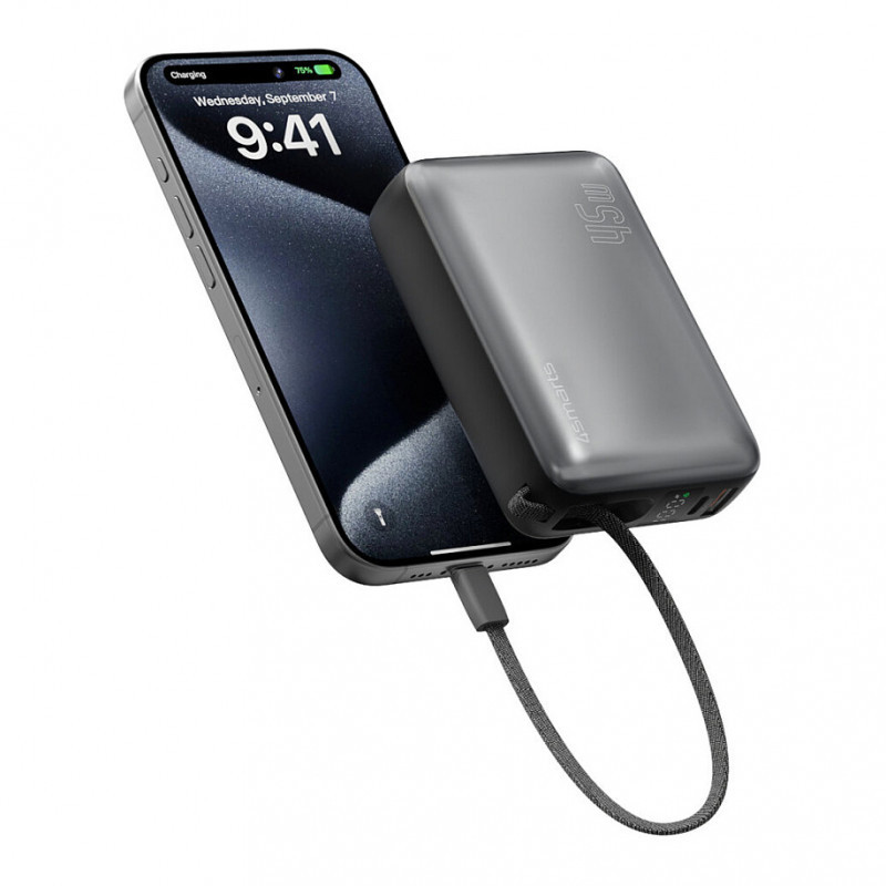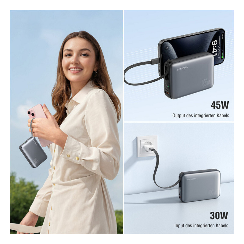 "4smarts 541409. Battery capacity: 20000 mAh, Battery technology: Lithium Polymer (LiPo), Fast charging technology: Hisilicon FCP, Power Delivery 3.0, Quick Charge 3.0. USB Type-A output ports: 1, USB Type-C ports quantity: 1. Total output power: 45 W. Product colour: Grey"\n"Charge whenever you want - without any additional cables