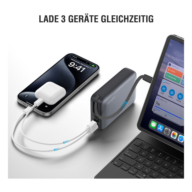 Whether smartphone, tablet or headphones - you can charge up to three devices at the same time, without the need for a power socket. The integrated USB-C cable, USB-C port and USB-A port provide your technology with an efficient power supply. If you only use the integrated USB-C cable or the USB-C port individually, you can even charge small laptops reliably. The total power is intelligently distributed during simultaneous charging - perfect for anyone who wants to keep their most important devices ready for use at all times.