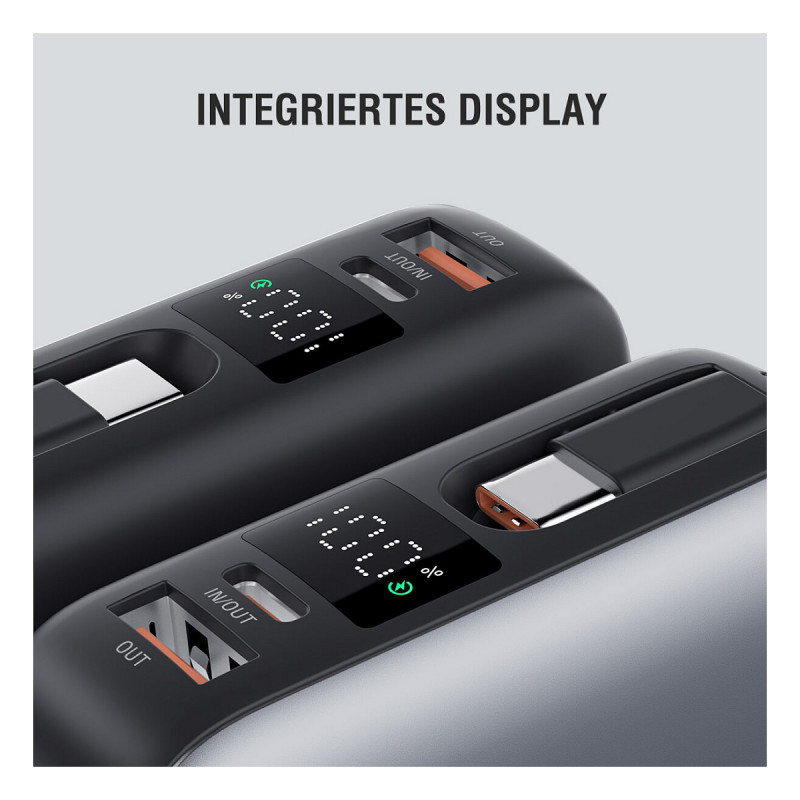 Imagine you're on the move, the battery is almost empty - and you don't have to spend ages looking for a cable. With the integrated USB-C cable, you always have the solution with you. Simply plug it in and continue working immediately, no matter where you are. Whether you're traveling, in a café or on the way to your next adventure: you can charge your devices quickly and reliably. For even more power in everyday life, we recommend an optional 30W USB-C power adapter. This way, you remain flexible, independent and ready for anything at any time.
