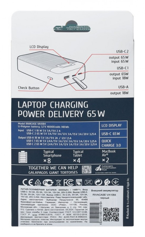 Rivacase VA1084 nešiojamasis įkroviklis Ličio polimeras (LiPo) 40000 mAh Juoda
