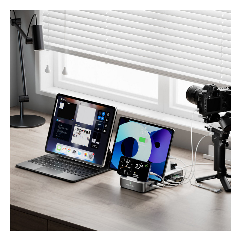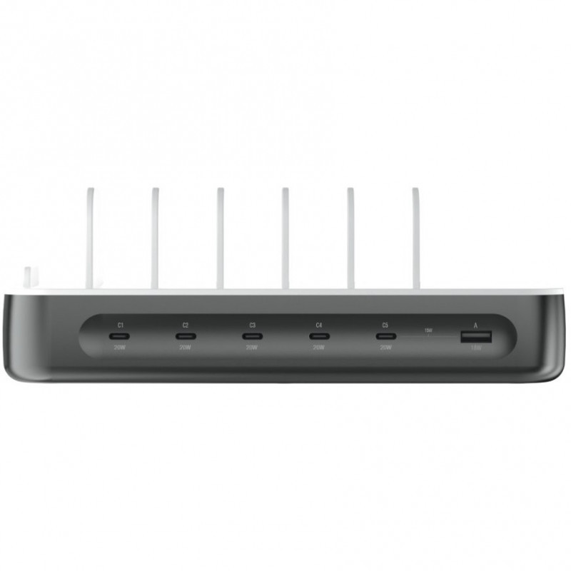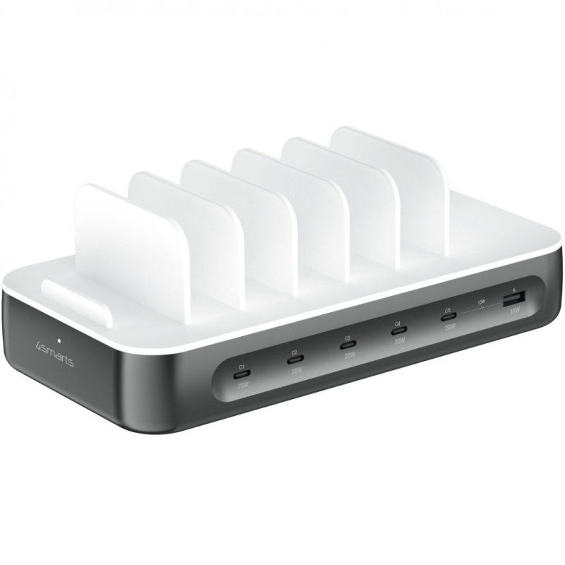 "4smarts 541277. Type: Freestanding, Material: ABS, Polycarbonate, Product colour: Grey. AC input voltage: 100 - 240 V, AC input frequency: 50/60 Hz, Maximum power: 100 W. Width: 255 mm, Depth: 119 mm, Height: 82 mm. Package weight: 850 g. Cables included: AC, USB, USB Type-C, Quantity per pack: 1 pc(s)"\n"Enough juice for your whole team