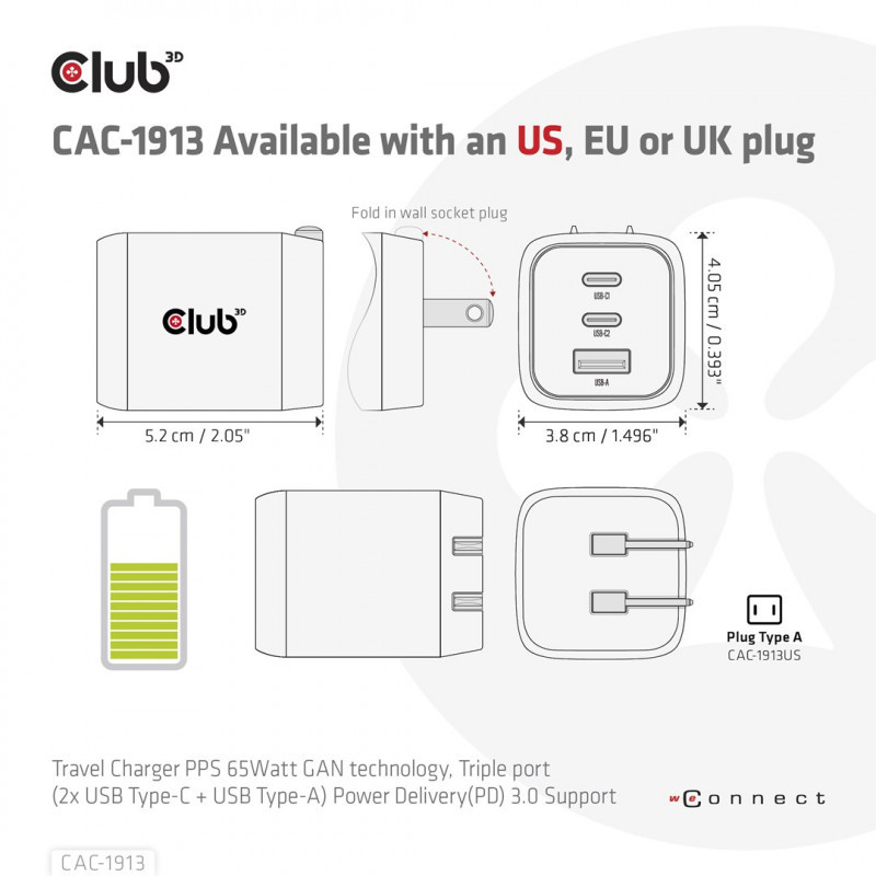 CLUB3D CAC-1913 mobiliojo įrenginio kroviklis Mobilusis telefonas, Knyginis kompiuteris, Išmanusis telefonas, Universalus Juoda AC Spartusis įkrovimas Vidaus