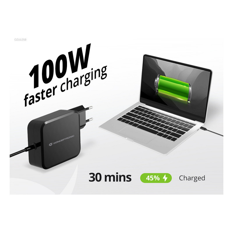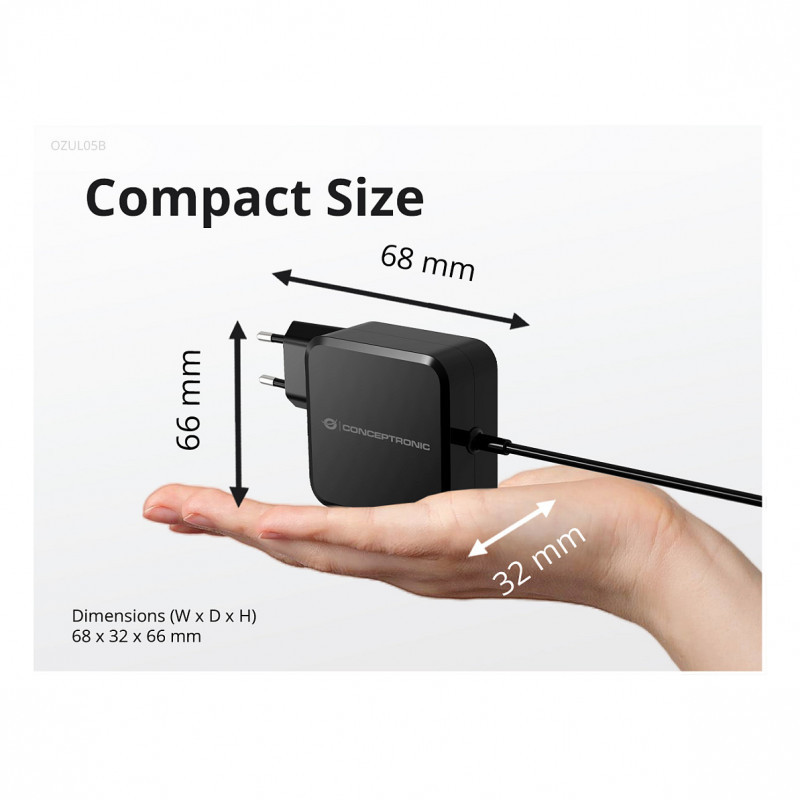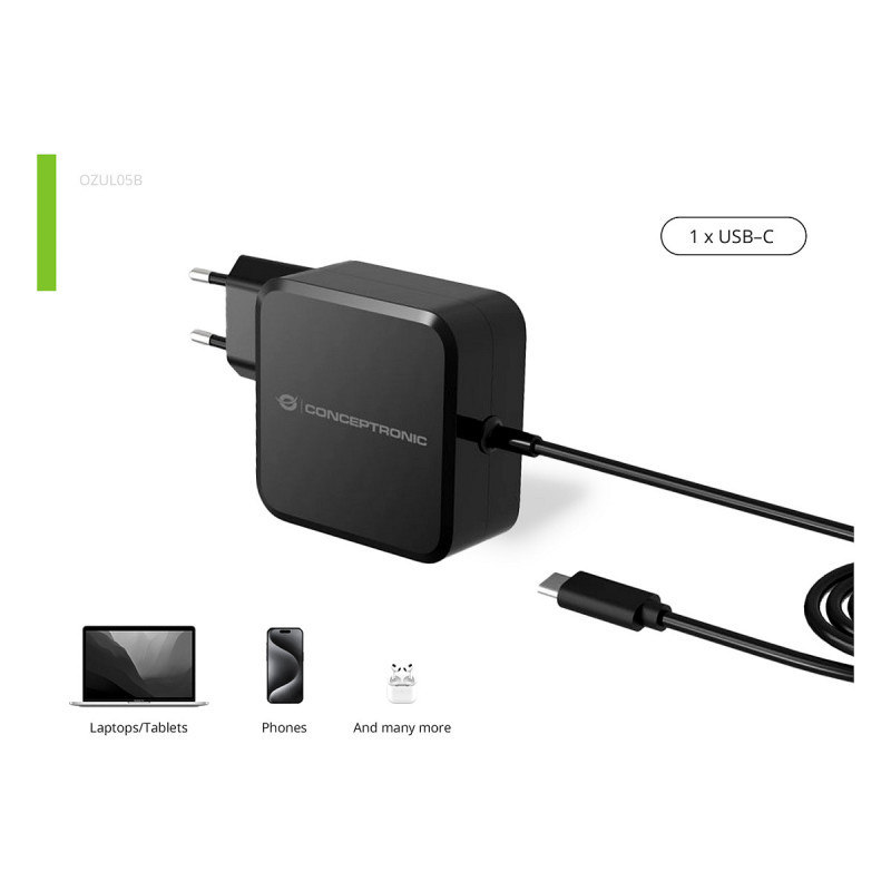 "Conceptronic OZUL05BE. Charger type: Indoor, Power source type: AC, Charger compatibility: Universal. Input voltage: 100 - 240 V, Maximum output voltage: 20 V. Power protection features: Overheating, Overload, Short circuit. Cable length: 1.8 m, Product colour: Black"\n"