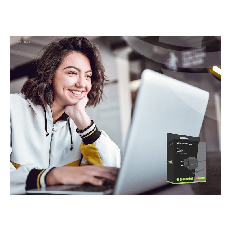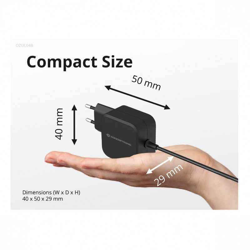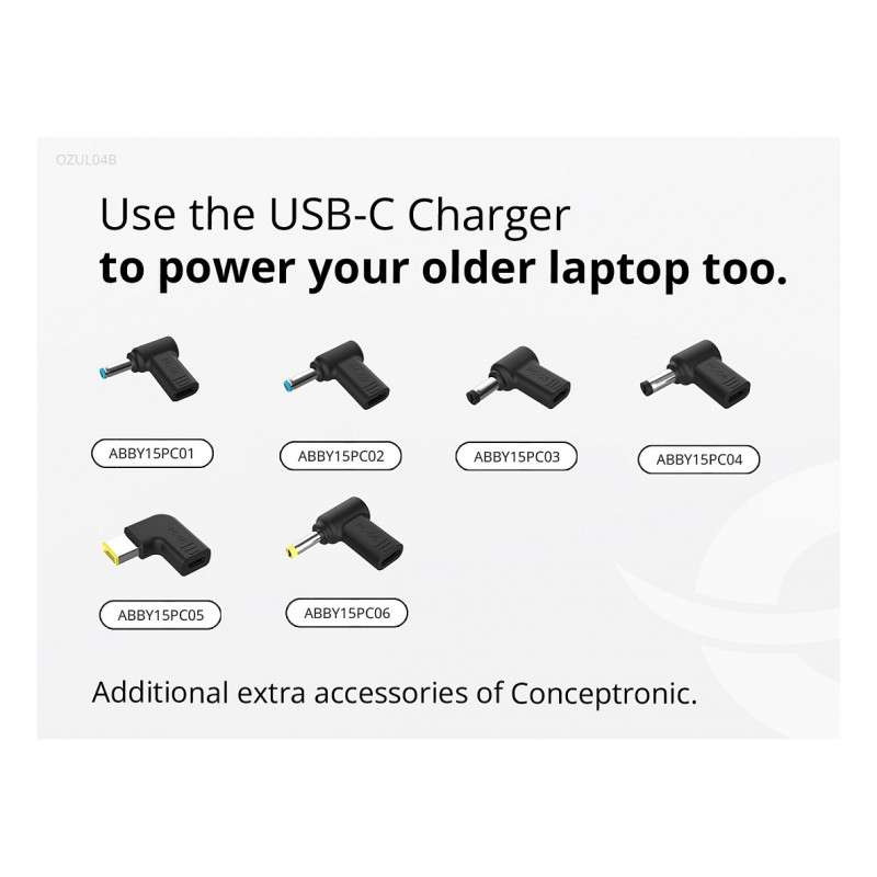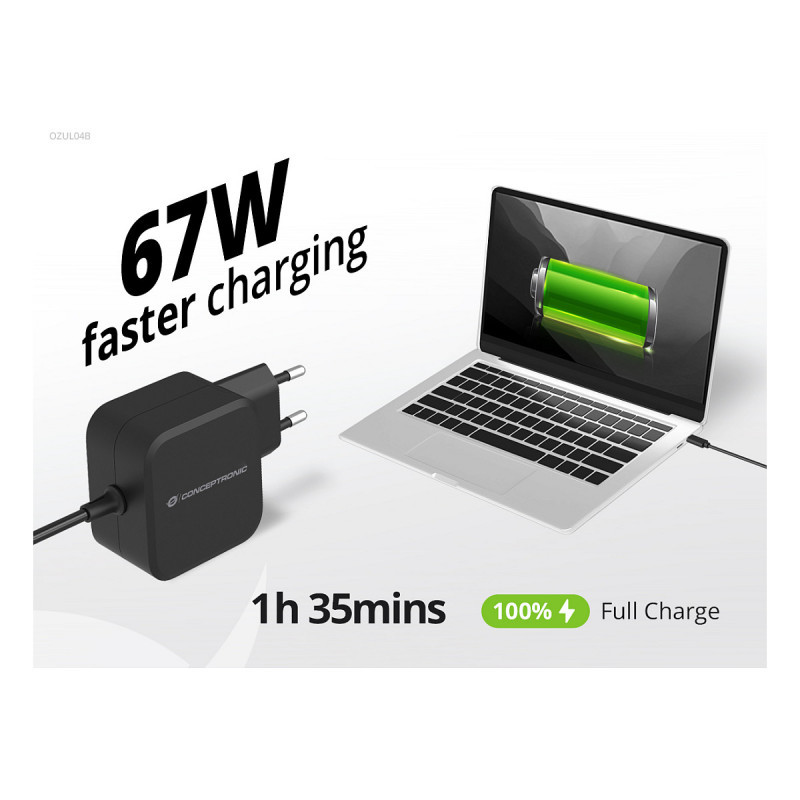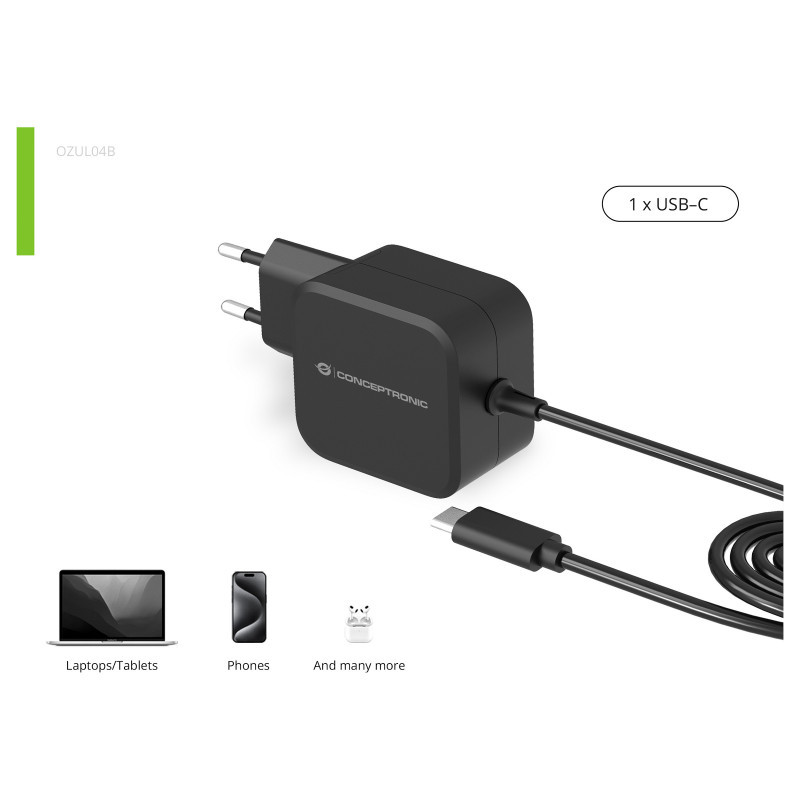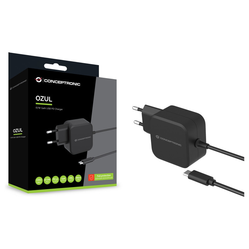 "Conceptronic OZUL04BE 67W GaN USB PD Charger, Built-in USB-C Cable. Charger type: Indoor, Power source type: AC, Charger compatibility: Universal. Input voltage: 100 - 240 V, Maximum output voltage: 21 V. Power protection features: Overheating, Overload, Short circuit. Cable length: 1.8 m, Product colour: Black"\n"