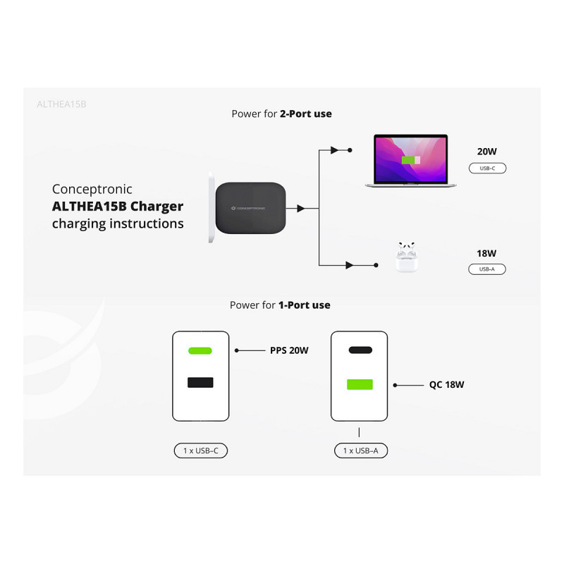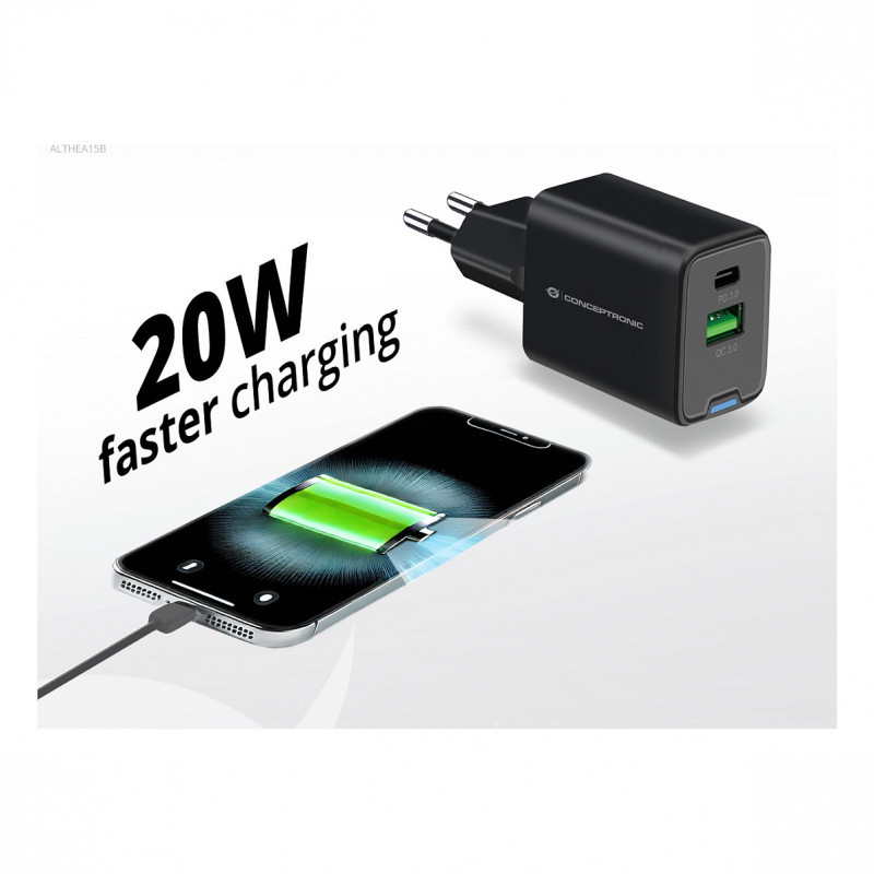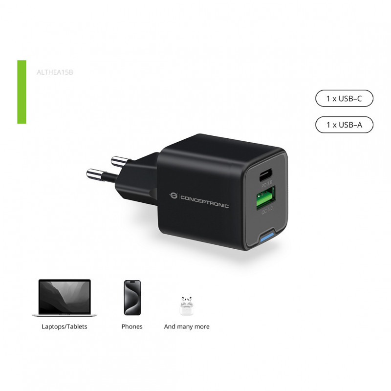 "Conceptronic 2-Port 20W GaN USB PD Charger, USB-C x 1, USB-A x 1, QC 3.0, PPS. Charger type: Indoor, Power source type: AC, Charger compatibility: Universal. Input voltage: 100 - 240 V, Maximum output voltage: 12 V. USB Type-C ports quantity: 1, Fast charging, Power protection features: Overheating, Overload, Short circuit. Product colour: Black"\n"