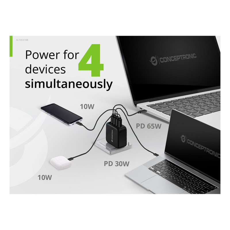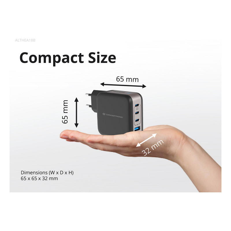 "Conceptronic 4-Port 100W GaN USB PD Charger with USB-C Charging Cable, USB-C x 3, USB-A x 1, QC 3.0, PPS. Charger type: Indoor, Power source type: AC, Charger compatibility: Universal. Input voltage: 100 - 240 V, Maximum output voltage: 20 V. USB Type-C ports quantity: 3, Fast charging, Power protection features: Overheating, Overload, Short circuit. Cable length: 1.5 m, Product colour: Black"\n"