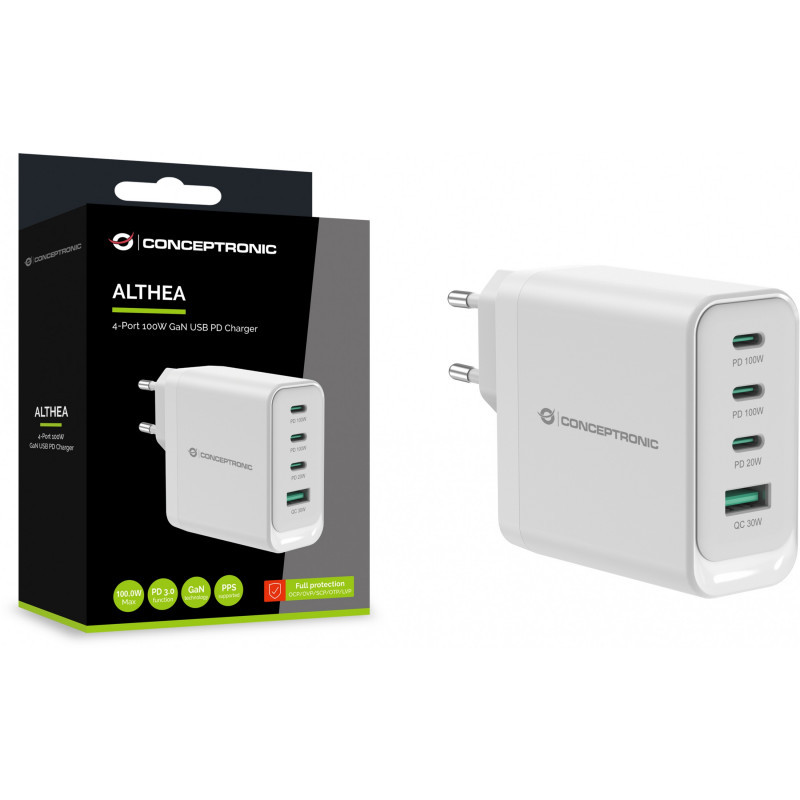 "Conceptronic ALTHEA22W100 4-Port 100W GaN USB PD Charger, USB-C x 3, USB-A x 1, QC 3.0, PPS, PD 3.0. Charger type: Indoor, Power source type: AC, Charger compatibility: Universal. Input voltage: 100 - 240 V, Maximum output voltage: 20 V. USB Type-C ports quantity: 3, Fast charging, Power protection features: Overheating, Overload, Short circuit. Product colour: White"\n"This charger harnesses cutting-edge Gallium Nitride (GaN) technology to deliver up to 100W of total power, ensuring exceptionally fast and efficient charging. It features a versatile port selection with 4 ports: 3 USB-C ports supporting Power Delivery (PD) 3.0 and 1 USB-A port with Quick Charge (QC) 3.0. This configuration allows for simultaneous charging of multiple devices with varying power requirements. The charger supports a wide range of output options from 3.3V to 20.0V, ensuring compatibility with everything from smartphones to laptops. Enhanced safety is provided through built-in protections against overload, short-circuiting, and overheating, safeguarding both the charger and your devices. It incorporates USB Power Delivery (PD) 3.0 and Quick Charge (QC) 3.0 technologies for rapid charging and features Programmable Power Supply (PPS) compliance to optimize charging efficiency while minimizing heat generation."